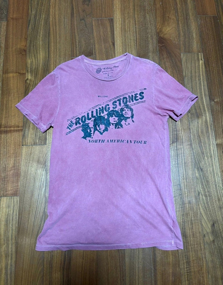 일상 및 운동시 입기 좋은 빈티지 락 티셔츠입니다. 최근 손석구씨의 반팔로 화제가 된 제임스펄스와 핏이 비슷합니다. 물빠진 분홍색의 색감이 남성미를 부각시키는 제품으로 미국 유학시절 버클리 음대 앞 레코드샵에서 구매한 기억이 있습니다. 롤링스톤즈의 북미 투어 제품으로 전형적인 혓바닥 로고가 아닌, 멤버들의 얼굴이 마치 러쉬모어산 조형물과 같은 형태로 배치되어 더욱 조예 깊은 디자인을 완성시킵니다. 100정도 입으시는 분들께 추천드립니다.