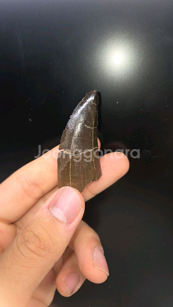 종명:torvosaurus. gurneyi(?) 크기2.32인치(5.9cm) 산출지층:모로코 볼모네층 정확한종은 알기 어렵지만 토르보사우루스과 공룡의 이빨화석 입니다. 산출된 지층을 고려하였을때 Torvosaurus gurneyi 로 추정됩니다. 토르보사우루스과 이빨화석은 화석시장에서 상당히 고가에 거래됩니다. 만약 이 화석이 gurneyi종으로 판명된다면 가격은 훨씬 치솟을거로 예상합니다.(학계에 발표된지 얼마 되지않아서 표본이 희소함) 양쪽 톱니가 어느정도 보존되었고 겉의 에나멜도 상당히 수준급으로 보존되었습니다. 지층특성상 파손된상태로 발굴되는경우가 많아 이 표본도 일부 수리가 이루어진 상태입니다. 100%진품 보증하고 가격조정도 가능합니다. 배송비 포함입니다.