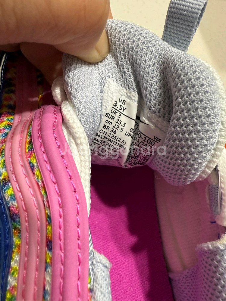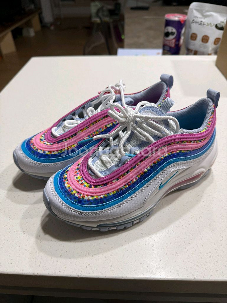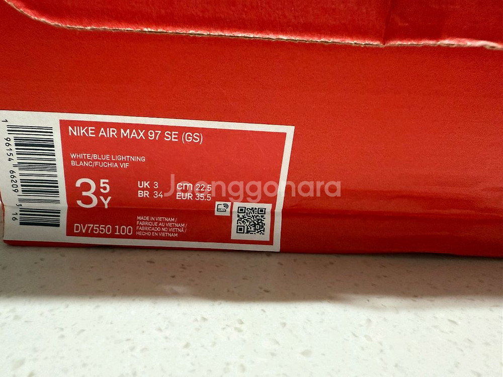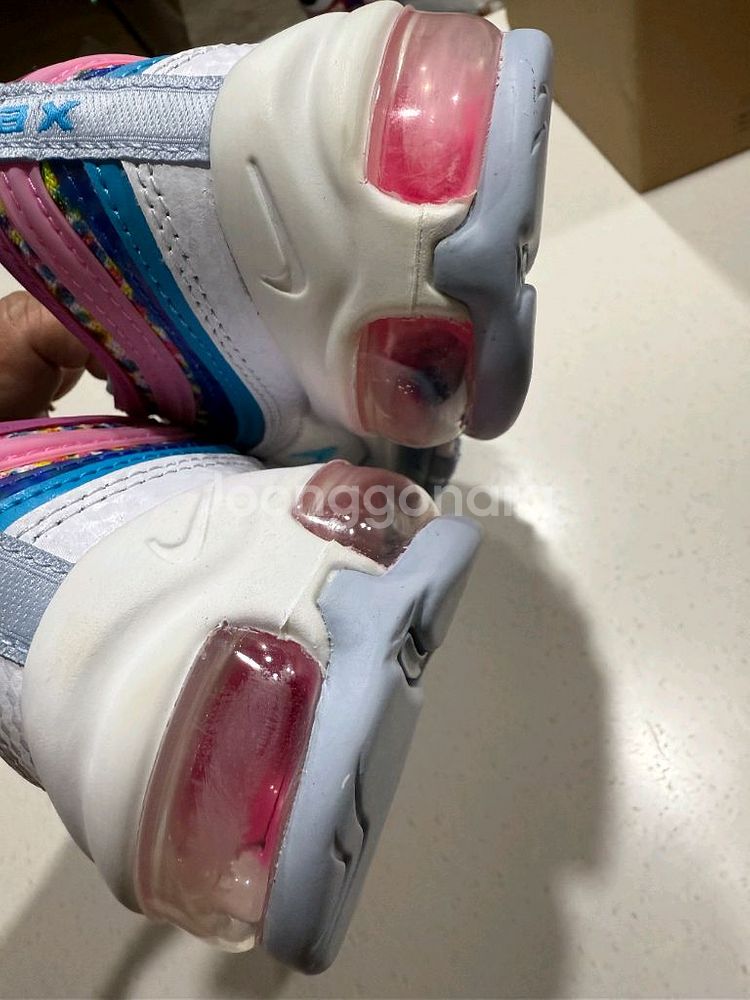 - 사이즈: 225mm - 색상: 흰색/블루 라이트닝/푸시아 VIF - 모델명: DV7550-100 - 박스 포함 -새상품 인데 에어쪽에 사진처럼되어있어 저렴히 내놓아요 착용하는데는 전혀문제없어요 어울리지않아 내놓아요 택포