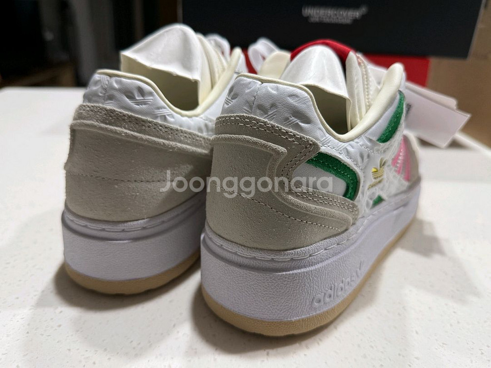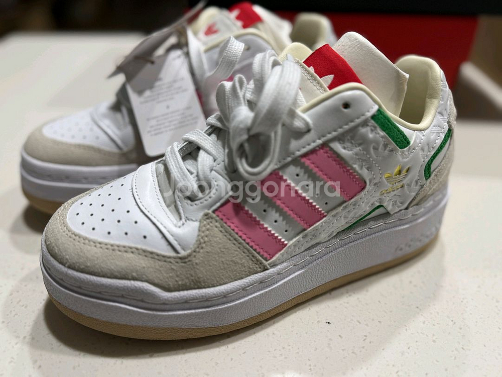 아디다스 포럼 XLG W 새상품입니다! 흰색 바탕에 분홍색 삼선, 초록색과 빨간색 포인트가 있어요. 사이즈는 230mm 해외판이고 박스가없어서 가격내렸어요 택포입니다. 매끄러운 가죽과 스무스 스웨이드로 구성됩니다. 부드럽고 편안한 안감 쿠션 진술 고무 아웃솔은 모든 것을 높입니다.