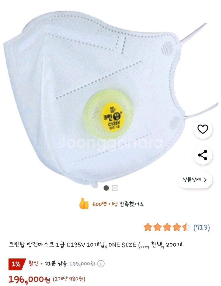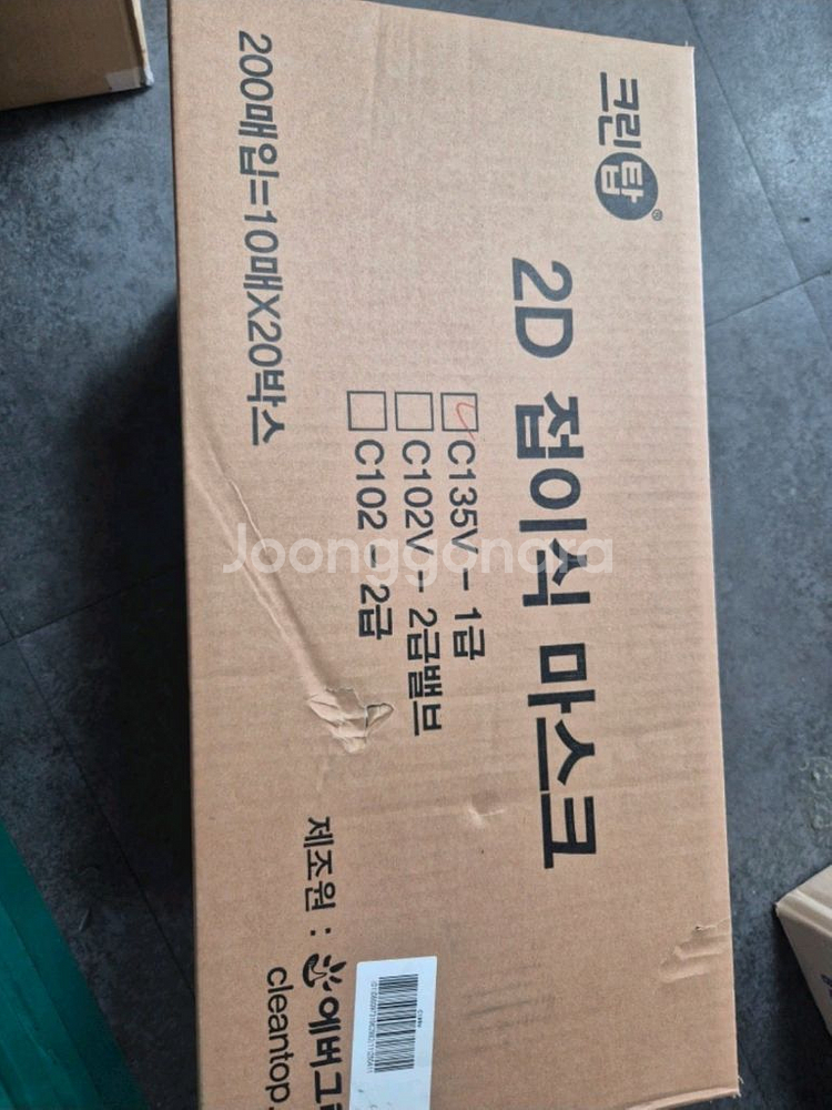 크린탑 C135V 1급 방진마스크 KF94 새 제품입니다! - 2단 접이식 배기밸브 KF94 형태 - 10개입 X 20개 = 총 200개 - 인터넷판매가 196,000원(200개 한박스 기준) 8,600원 (10개 기준) 이에요 - 한박스 12만원 판매합니다!