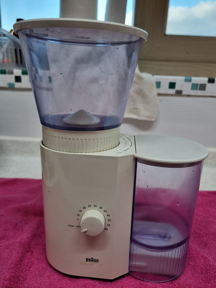 개인정보(거래정보)를 주고받는 행위는 사기에 노출될 수 있으므로 즉시 중고나라로 신고해 주세요BRAUN 커피그라인더 커피분쇄기 BRAUN TYPE 3045 1992년경 구입, 필요시만 가끔사용했음. 작동 잘됨. 깨진곳 없음. 사진의 부속품 모두 포함. 박스 없음. 판매 12만원에서 3만원으로 인하