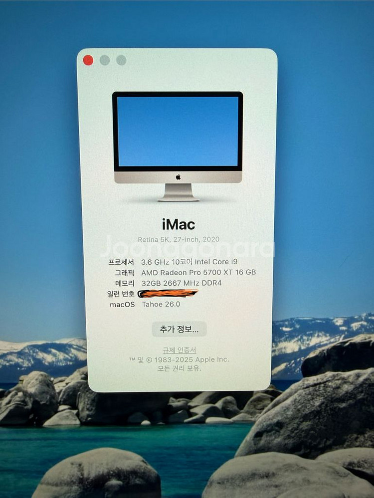 아이맥 5K 27인치 2020 판매합니다 * 프로세서: 3.6 GHz 10코어 Intel Core i9 * 그래픽: AMD Radeon Pro 5700 XT 16 GB * 메모리: 32GB 2667 MHz DDR4 * 저장 디스크: 500GB 초기화 해뒀고 세팅하셔서 사용하시면 됩니다. 박스 있고 구성품 키보드랑 마우스, 전원케이블 있습니다. 화성 수원 가능합니다 초기화해서 드릴꺼고 사용감은 있지만 패널이나 기다 큰 흠집은 없어요 흠집은 사지에 올혀둿어요