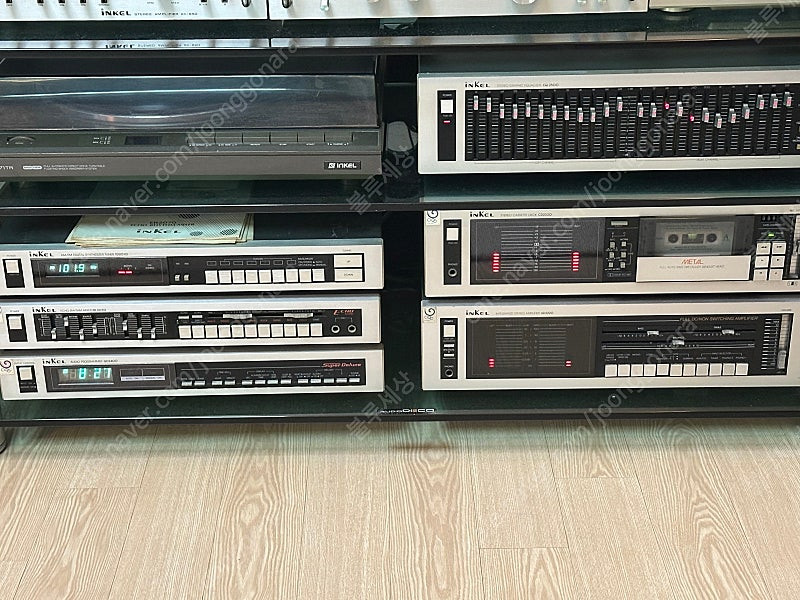 인켈 오디오 세트 판매합니다. 구성품은 앰프 AD2220, 카세트데크 CD2320, 이퀄라이저 EQ2500, 튜너 TD2010, 정체를 알수 없는오디오프로그래머 GD2400, 에코리듬믹서 ER2070 이렇게 6단입니다. 카세트테크는 최근 벨트새로 교체하였고, 이퀄라이저는 음색조절기 2개가 분실되었습니다. 앰프는 잘 작동하며, 둿면 스피커단자부분의 스프링이 끊어진 것 같으나 스피커선 연결에는 이상없습니다 .(스피커 A, B 연결 구성하는 총 4개 연결단자 중 1개가 스프링이 끊어진 것으로 보임) 튜너는 소리가 작게 나와서 수리가필요합니다. 왼쪽의 나머지 2개는 기능이 뭔지몰라 그냥 장식용으로 있습니다. 어렵게 셋트구성했으나 기기 변경 및 공간이 협소한 관계로 판매하며, 부피와 무게가 있는만큼 2,9호선 당산역 근처에서 직거래만 합니다. * 텐테이블은 판매대상에서 제외 🚨회원님의 거래 게시글을 노린 중고나라 운영진 사칭 피싱 사이트를 주의하세요🚨