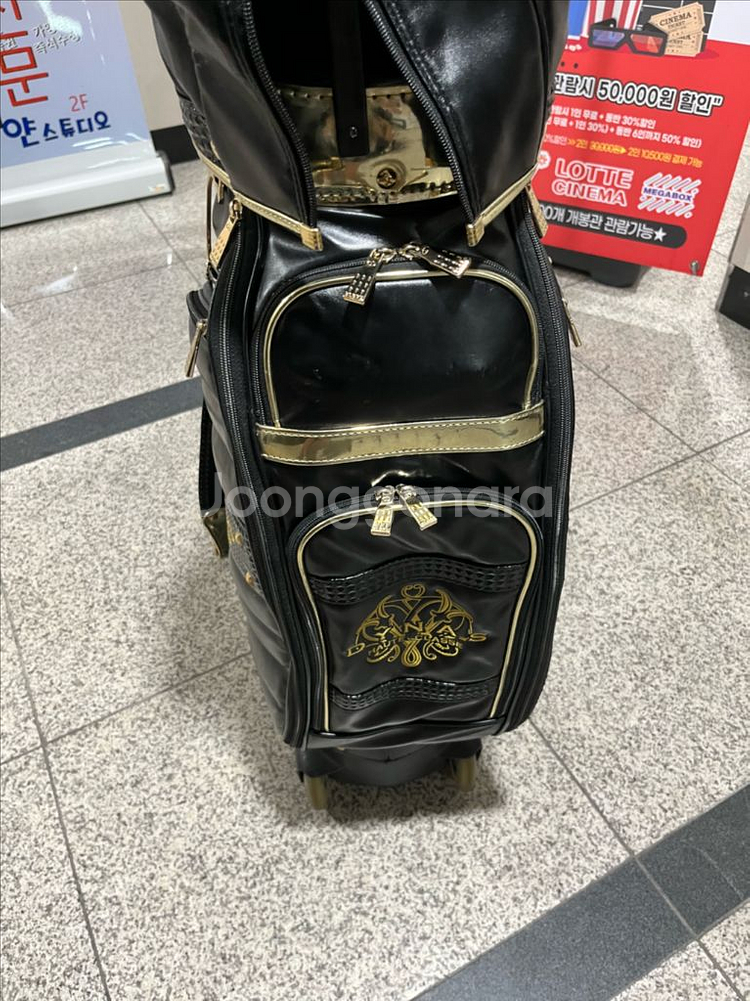 다이너스 바퀴 달린 캐디백입니다 구매가 100만 원입니다 커버 지퍼가 망가진 거 외엔 다른 하자 없어요 따로 지퍼만 수리하셔서 사용하셔도 됩니다 백 안에 아이언 거치대같이 드립니다 깨끗하게 관리 잘 된 가방이에요