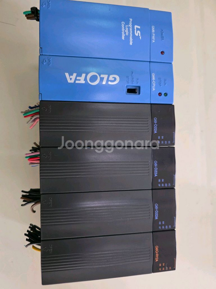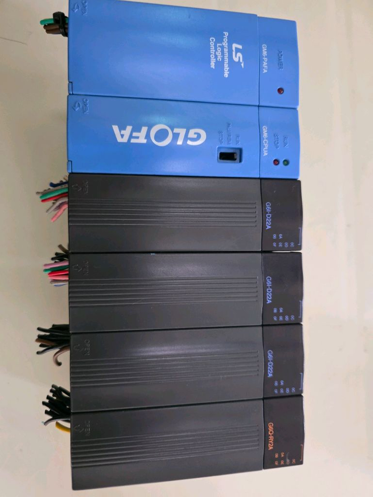 LS산전의 중형 PLC 시리즈 GLOFA GM6 시스템 전원 모듈(GM6-PAFA)과 CPU 모듈(GM6-CPUA) 포함 디지털 입력 모듈 G6I-D22A (2EA) 장착, 다채로운 신호 처리 가능 릴레이 출력 모듈 G6Q-RY2A (AC/DC 제어 가능) 장착 4슬롯 베이스 GM6-B04M에 장착된 구성 공정 자동화, 기계 제어, 생산라인 제어 등 다양한 산업용 제어에 활용 중고 제품, 외관 양호 /