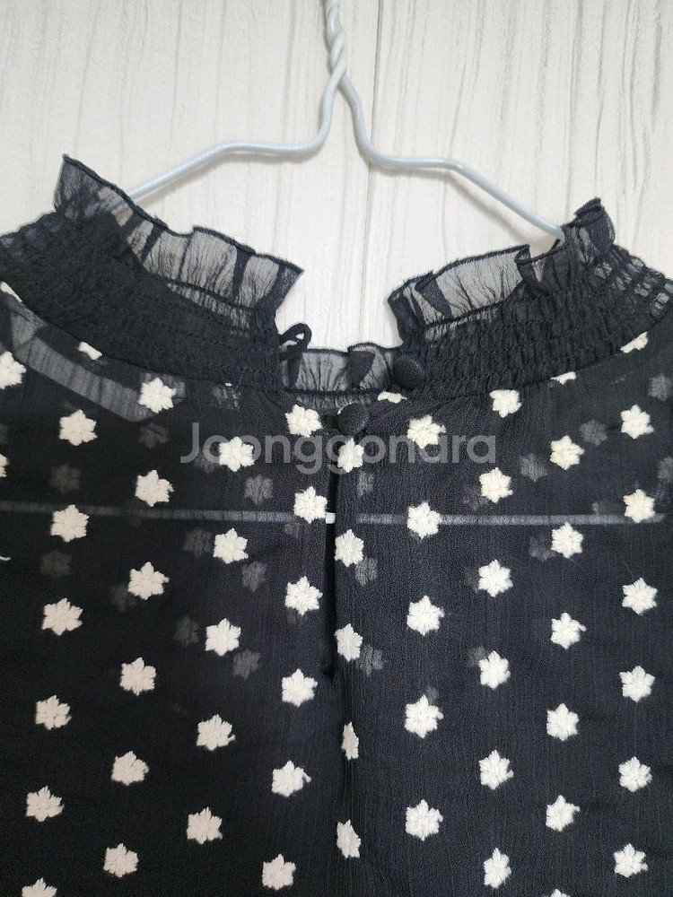 잇미샤 블랙 도트 블라우스입니다. - 러플 디테일이 있는 디자인이에요 - 시스루 소재로 되어 있습니다 - 사이즈는 55~55반입니다 한번입고 세탁 보관중^^