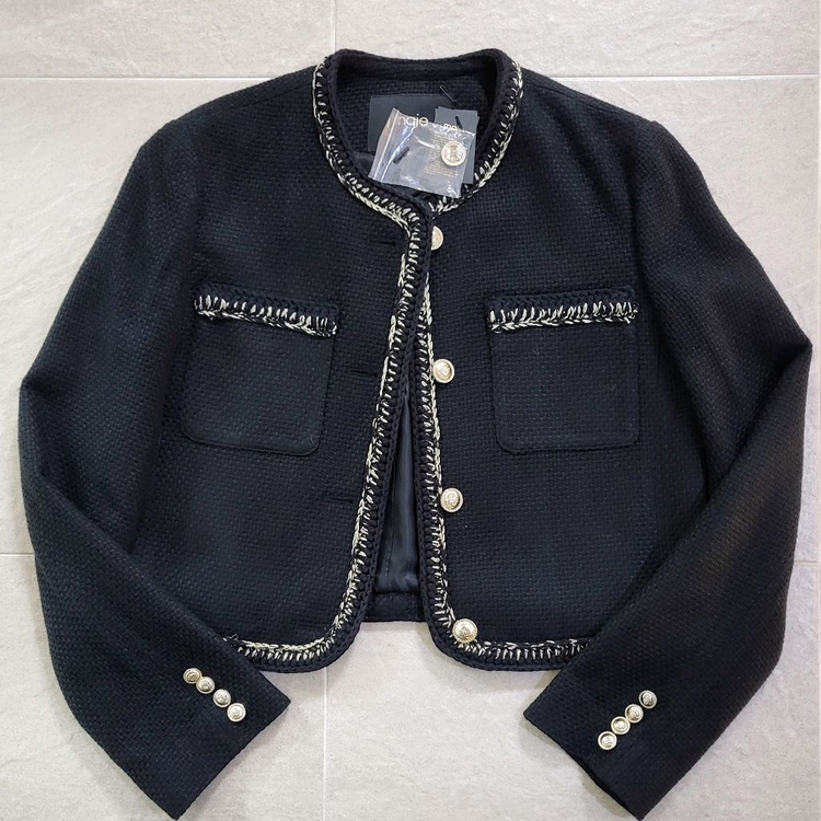 아이디룩몰에서 2023년에 구입했구요 시착만 한 새상품입니다 블랙에 금사가 포인트되서 고급스럽고 이뻐요 사이즈 55구요 소재가 가볍고 핏도 예뻐요 적당한 크롭이라 부담스럽지 않아서 좋아요 무료배송 해드립니다 택과 여분단추 동봉해 드립니다