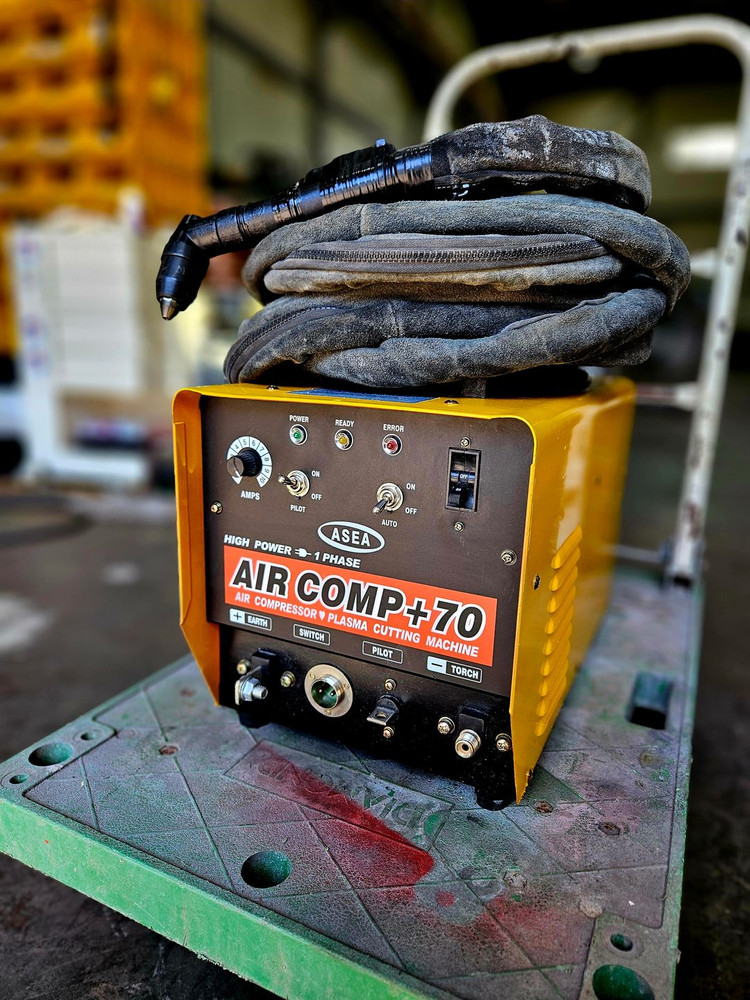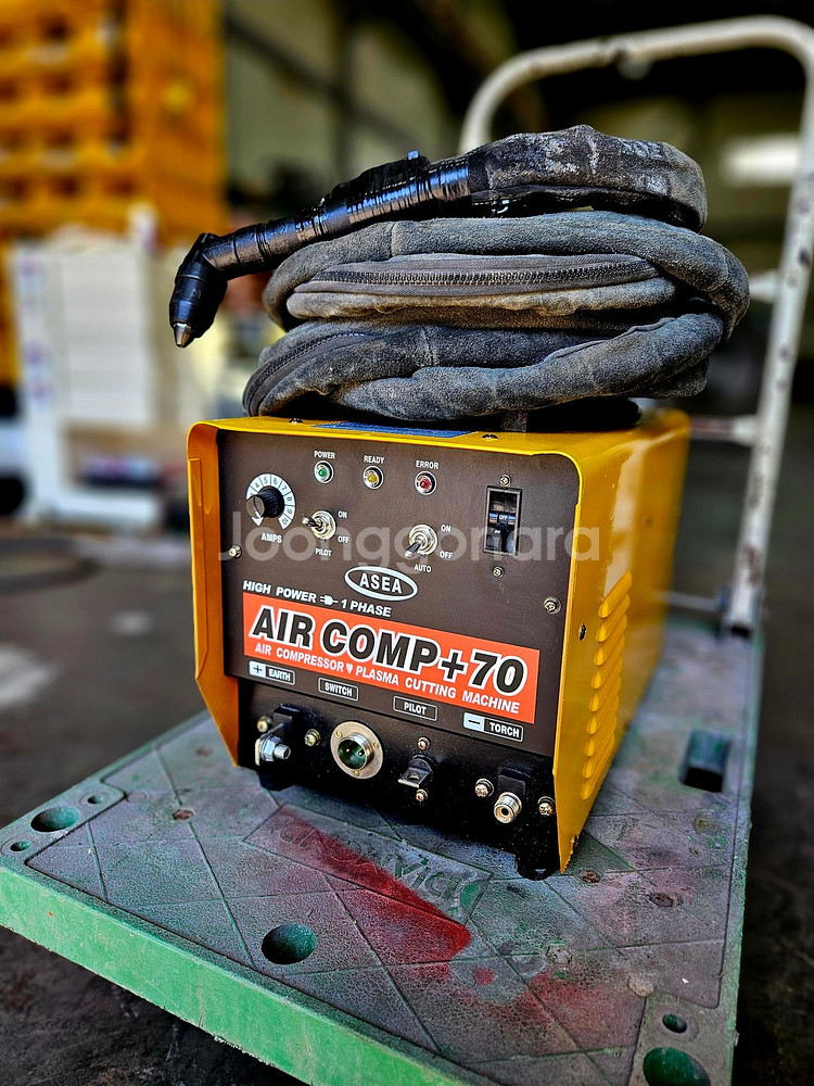 현장에서 몇번 사용안한 깨끗한 국산 프라즈마절단기입니다 국산 아세아 콤프레샤 내장형 제품입니다 콤프내장형으로 따로 콤프레샤 없이 절단이 가능합니다 토치 어스 포함 풀세트입니다 절단 잘됩니다