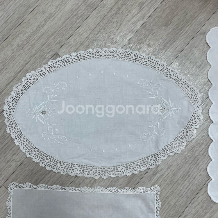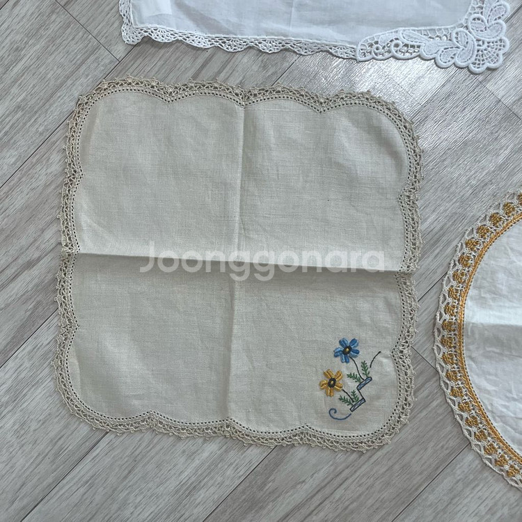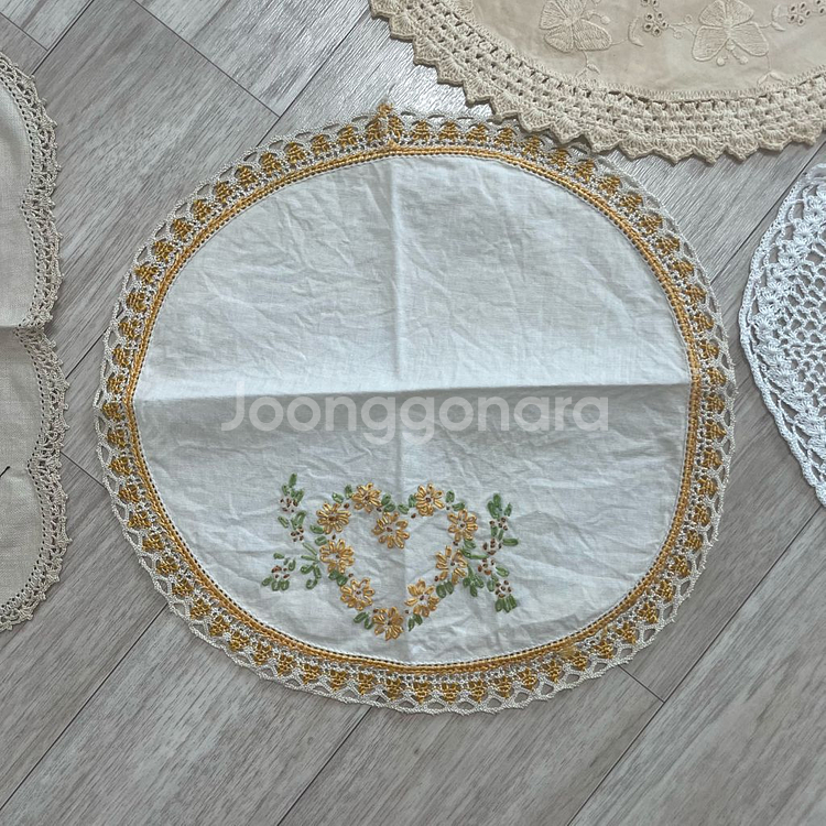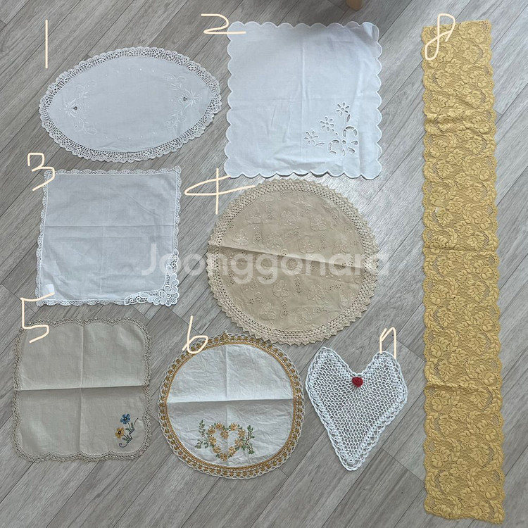 다양한 모양의 레이스 손뜨개 매트 모음입니다. - 흰색, 베이지색, 노란색 등 여러 색상이 있어요 - 앤틱한 분위기를 연출하기에 좋아요 - 테이블이나 가구 위에 장식용으로 사용하기 좋습니다 빈티지제품입니다 . 새상품 컨디션아니고 오염이나 뜯김있을수 있습니다 . 번호로 문의 주시면 상세사진,사이즈,가격 알려드리겠습니다 .