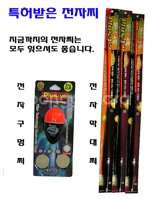 특허 받은 전자찌 새로운 개념의 전자구멍찌와 전자막대찌입니다 3배의 밝기로 시인성이 뛰어나며 배터리 수명 또한 2배 이상 지속됩니다 배터리도 저렴한 2032 동전배터리를 적용해 가격부담을 줄였습니다 전자막대찌 또한 한알 200원이면 구매할수 있는 배터리입니다 전자구멍찌 3B,05호,08호,1호,1.5호,3호 가 있습니다. 전자 고리찌는 0, B, 2B 가 있습니다. 한개 4500원입니다 막대전자찌 05호,08호, 1호, 1.5호, 2호, 3호 가 있습니다. 길이는 1.5호까지 50cm이고 2호,3호는 60cm 입니다 가격은 한개 5500원입니다.