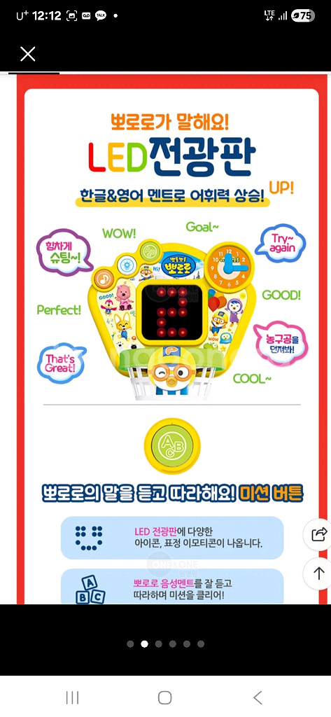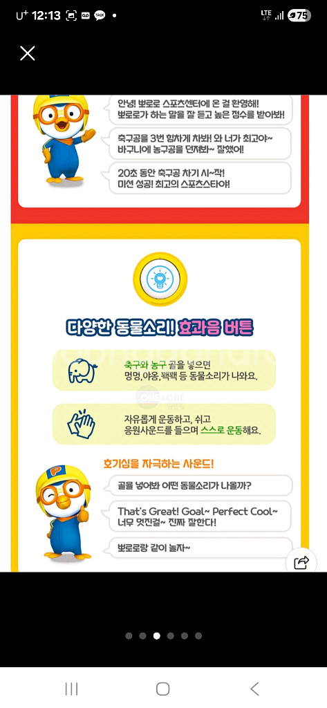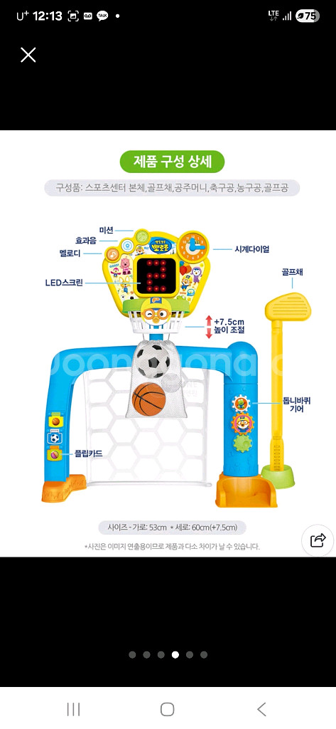 뽀로로 3in1 스포츠 센터입니다~ 농구, 축구, 골프를 즐길 수 있어요! - LED 전광판으로 다양한 아이콘과 표정 이모티콘이 나와요 - 다양한 동물 소리 효과음 - 높이 조절 가능 (최대 7.5cm) - 사이즈: 가로 53cm x 세로 60cm (+7.5cm)