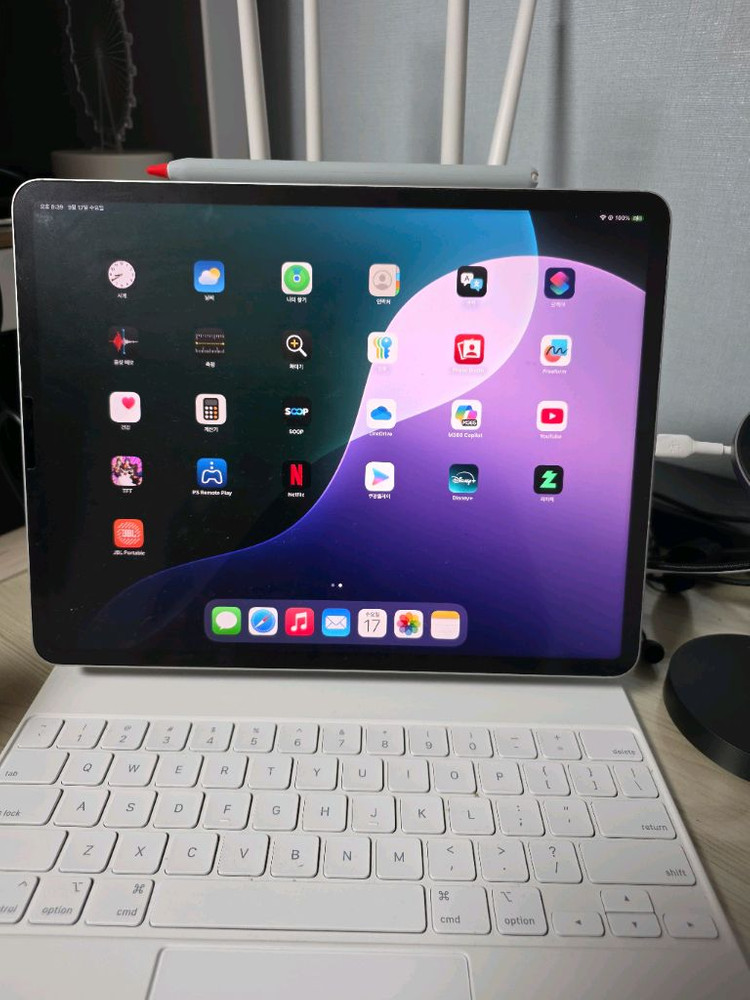 아이패드 프로 12.9 인치(6세대) 셀롤러 512G + 정품 매직 키보드 영문 자판 + 애플펜슬 2세대 셋트로 판매합니다. 이번에 업무로 갤탭으로 변경하여 판매합니다. 그 동안 집에서 넷플릭스 동영상 머신으로 사용만 했습니다. 본체에 앞뒤 보호필름 붙여 있고, 카메라에도 보호필름 붙여 둔 상태 입니다. 매직 키보드는 세월의 흔적이 있으나, 패드는 집에서 거치형태로 사용해서 상태는 좋습니다. 우체국 택배로 보내 드리며, 사진에 있는 제품 외 다른 것은 없습니다. 포장은 안전하게 포장해서 보내 드립니다. 판매 가격은 150만원 입니다.