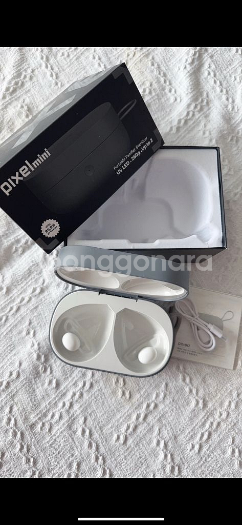 플레드 픽셀 미니 젖꼭지 살균 소독기입니다. 23년 출산 준비하며 구매했는데 아이가 쪽쪽이를 안물어서(손쪽이…) 외출때 두세번 사용했습니다 - 휴대용 UV/LED 살균 소독기 - 젖꼭지 2개까지 살균 가능 - 구매 가격은 44,000원입니다 - 박스 포함, 충전 케이블과 설명서도 같이 드려요 택배비는 얼마일지 몰라 5천원으로 해 두었습니다 !