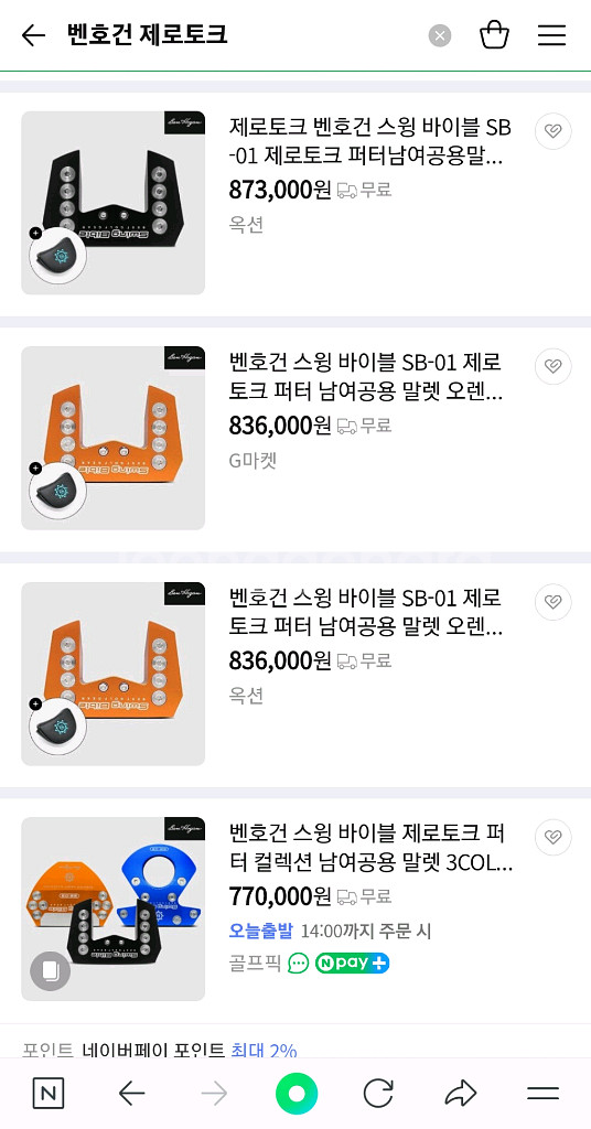 스윙바이블 벤호건 퍼터 새상품입니다. 3가지 종류가 있습니다. - 길이: 34인치.33인치 선택가능 - 비닐 포장 그대로인 새 제품이에요 벤호건 sb01.sb02. sb03 세가지 종류이며. 제로토크라 스웡 밸런스가 아주 탁월합니다. 터치감 또한 아주 좋구요. 이제 드라이버 아이언 잘치고 퍼터에서 타수 잃지 마세요. 인터넷가77~90하는 제품 입니다. 아주 저렴히 내놓습니다