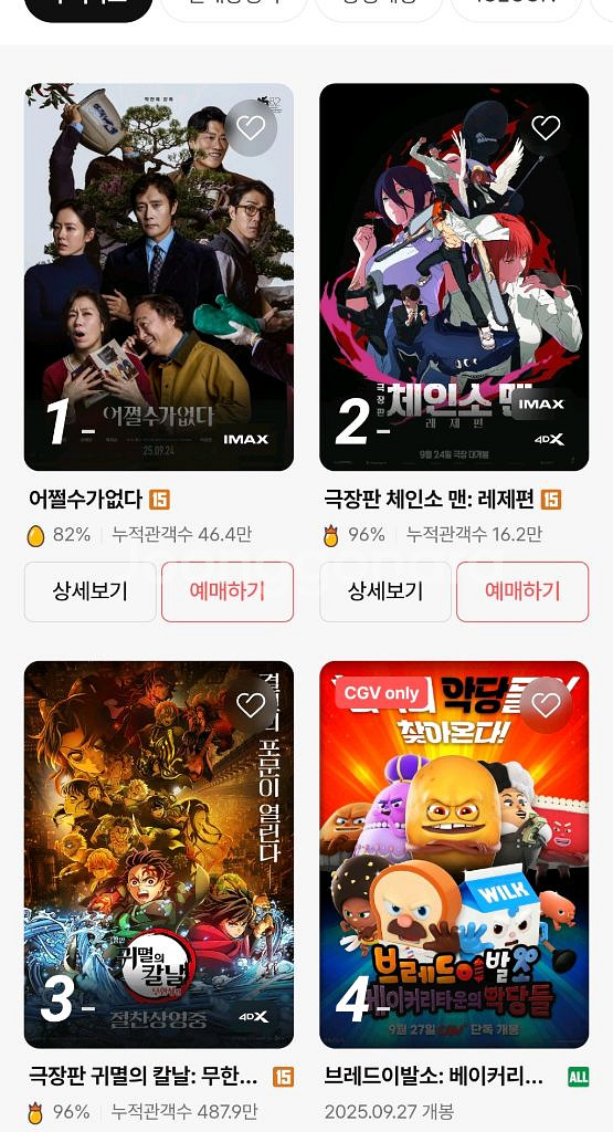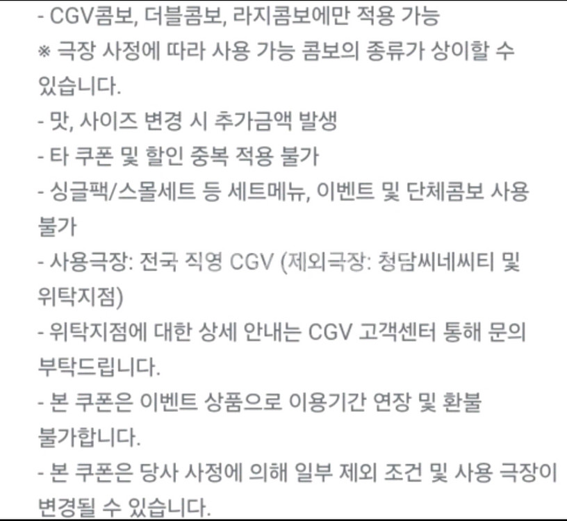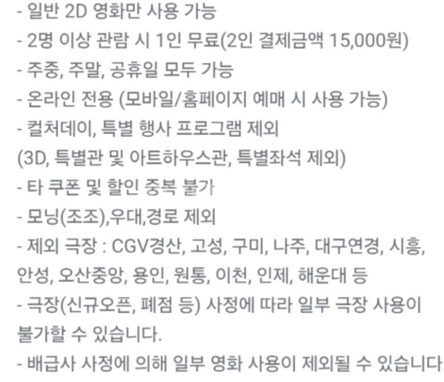 CGV 1+1영화관람권 및 콤보 50% 할인권 유효기간은 (~10/31까지) 아래유의사항 확인부탁드리고 쿠폰 사용방법 아시는분과 거래원합니다. 1+1 쿠폰은 1인 결제시 1인 무료인 할인권이고, 2d 일반관 영화 금액 15000원은 모두 해당됩니다. 리클라이너관 및 특별관 불가입니다. 계좌거래 가능하고, 거래 후 취소 불가합니다. 채팅 또는 안심문자주세요. 유의사항 [ 1+1 영화관람권 ] * 2D 영화만 사용 가능 * 1인 유료 결제시 1인 무료 * 주중, 주말, 공휴일 모두 사용 가능 * 제외 극장 및 기타 유의 사항 사진 참고 [ 콤보 50% 할인권 ] * CGV콤보, 더블콤보, 라지콤보에만 가능 * 맛, 사이즈 변경 시 추가금액 발생 * 제외 극장 및 기타 유의 사항 사진 참고