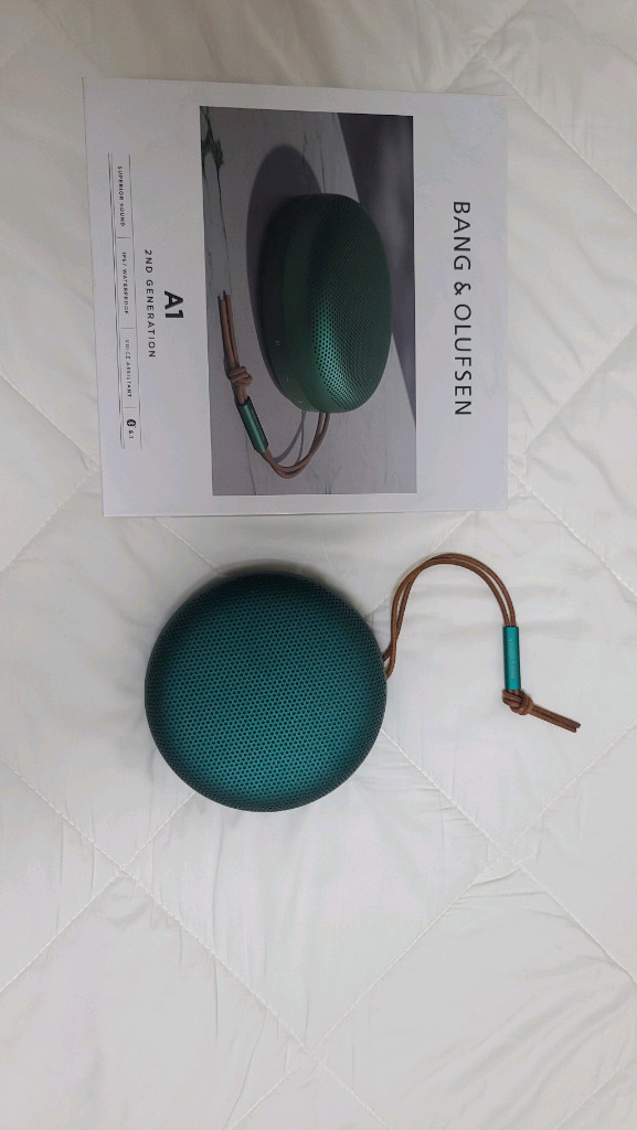 뱅앤올룹슨 A1 2세대 블루투스 스피커입니다 색상은 예쁜 청록색이에요~ - 뛰어난 사운드 - IP67 방수 기능 - 가죽 스트랩 포함 코오롱정품 입니다 박스포함 모든구성품있고 실사용 많이 안했습니다. 상태 좋아요~
