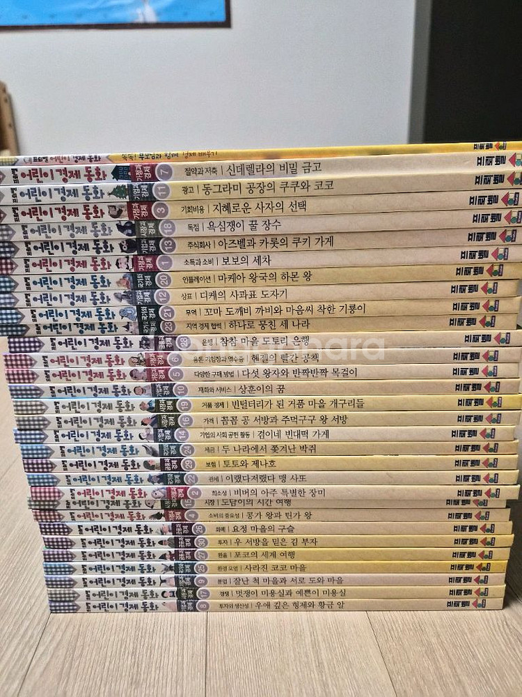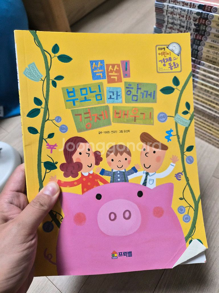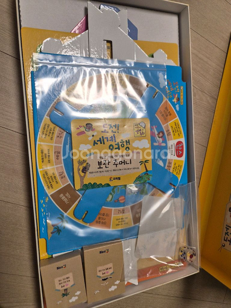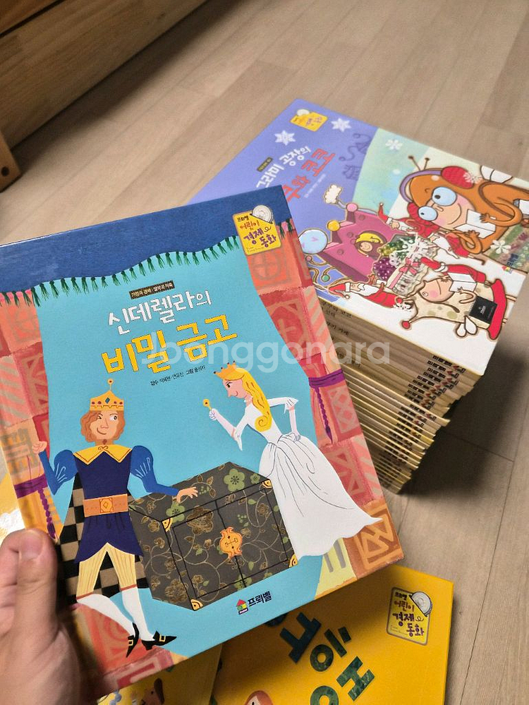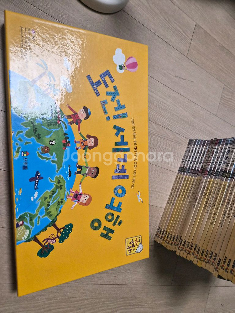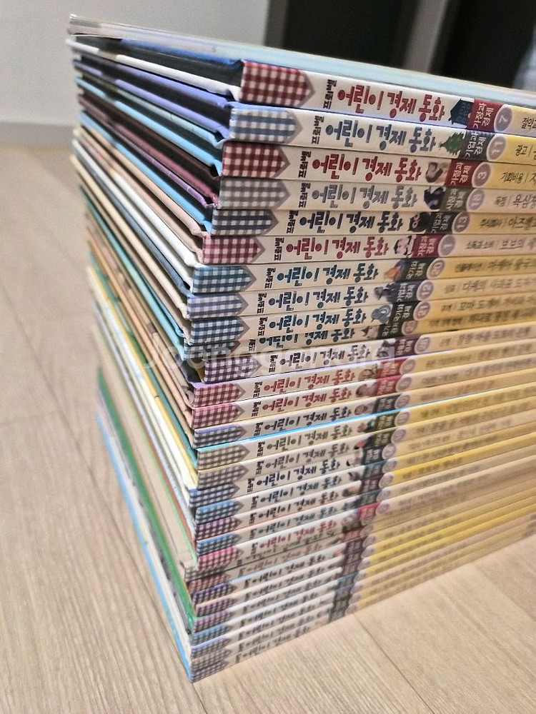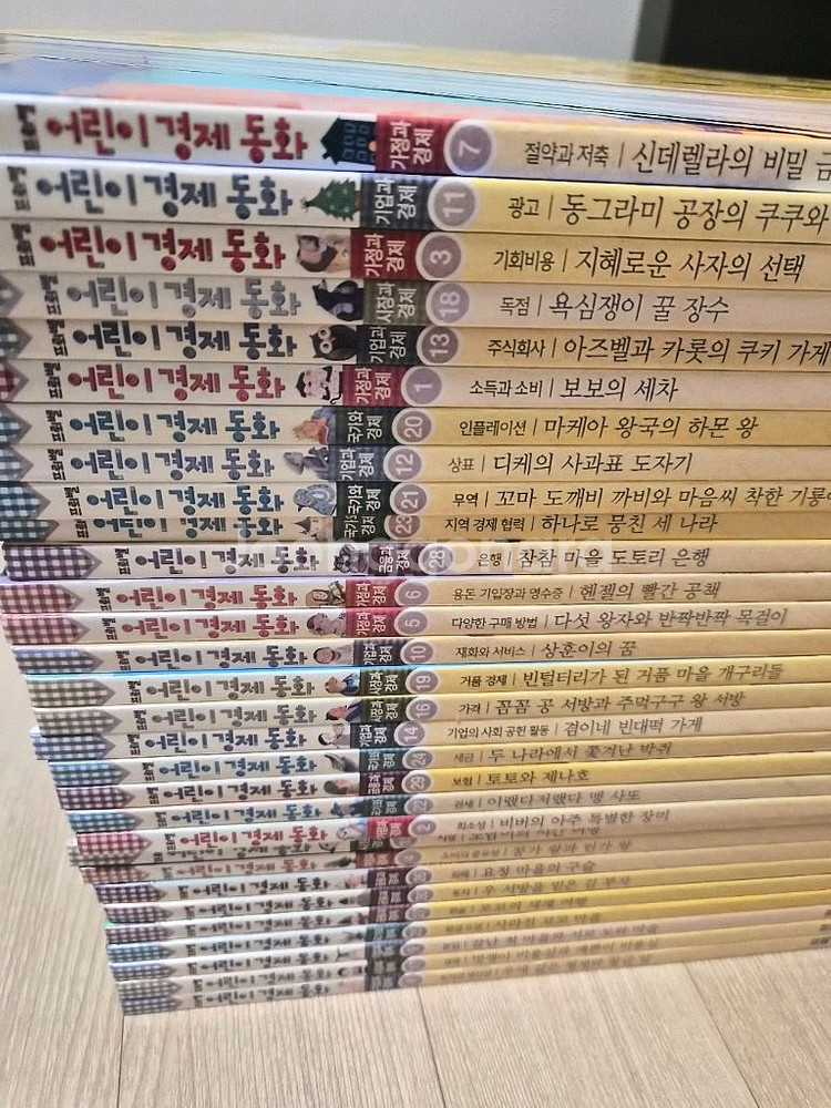 어린이 경제 동화 전집과 '도전! 세계여행' 보드게임 함께 드려요~ 프뢰벨 경제동화 재밌게 잘 읽었어요. 새책컨디션으로 깨끗합니다. 어린이 경제 동화는 여러 권으로 구성되어 있으며, 보드게임은 상자, 게임판, 주사위, 카드 등 구성품 모두 포함입니다. 구성품 새것