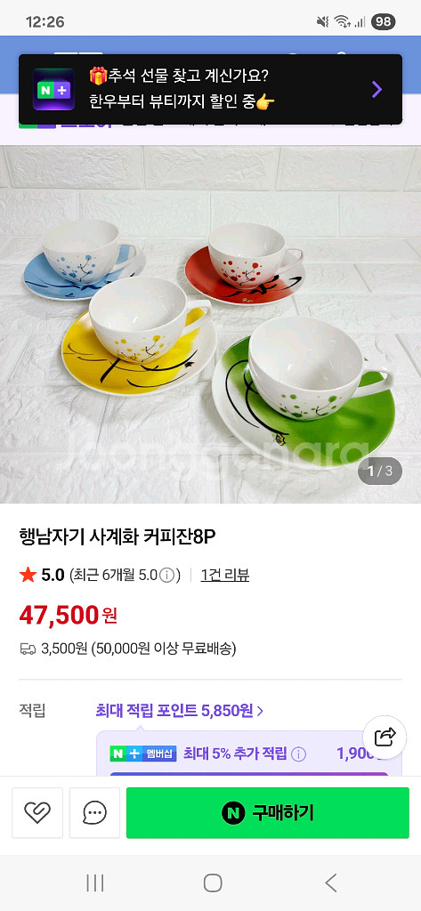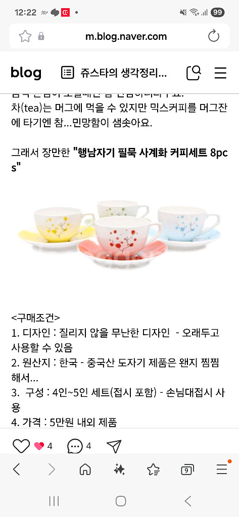 새제품) 행남자기 사계화 커피잔 8P 중고 거래인만큼 교환, 환불 어려우니 이점 양해 부탁드립니다. 궁금하신 사항 채팅 주시면 답변 드립니다. 일반택배시 +4,000원 추가되며 반값택배시 +2,200원이 추가됩니다. 반값택배란 편의점서 → 편의점으로 배송되는 것으로 직접 찾으러 가야하며 일반택배보다 +1~2일 추가 소요됩니다.