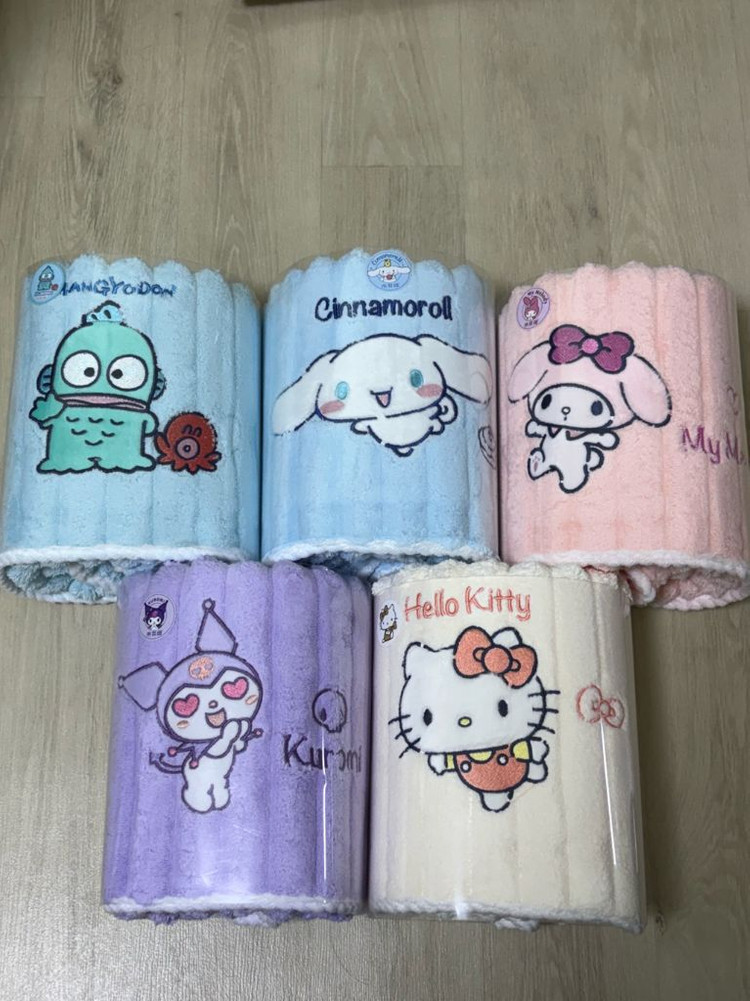 비닐 포장 그대로 보관중이며 정품 택 달려있고 사이즈는 70x140 입니다! 안에 보면 걸어둘수 있게 고리도 있습니다! 물놀이 가서 아이들이 사용하기 좋아보여요! 개당 가격입니다! 쿠로미, 키티, 마멜은 품절
