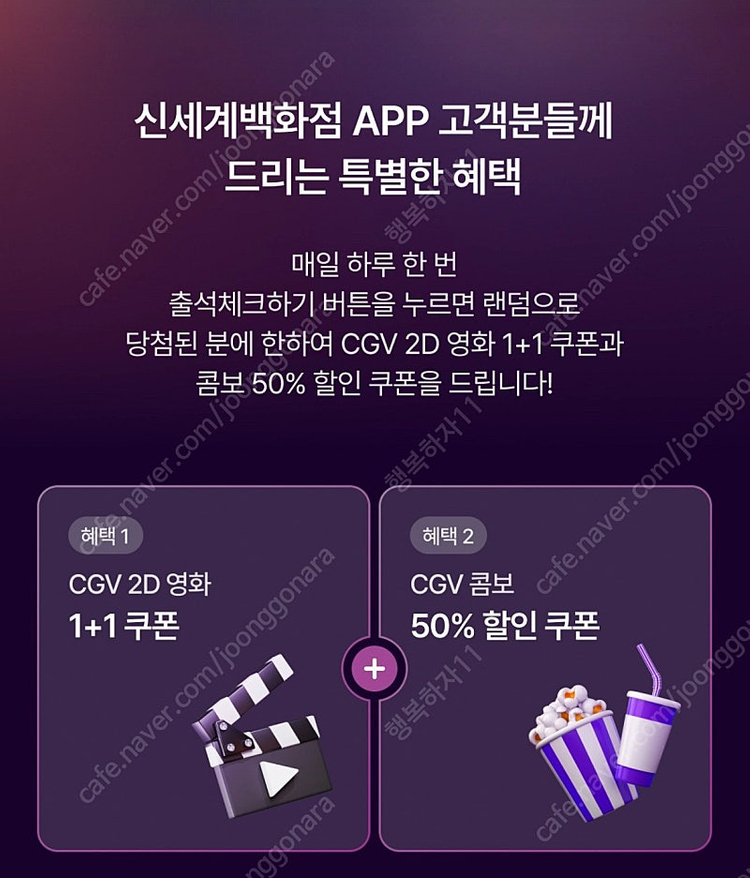 📢 제목에 "제조사/ 브랜드 명"과 "티켓명(ex. 스타벅스 아메리카노 Tall) ”을 넣어 작성하면, 보다 빠른 판매가 가능합니다! 📢 게시글 작성 시 배송 방법에 “직거래”와 “내 위치” 설정할 경우, 보다 빠른 판매가 가능합니다! 📢 내가 가진 커피, 편의점 e쿠폰을 <J쿠폰>에서 간편하고 빠르게 판매가 가능합니다! 2일 이내 판매금을 정산 받아보세요. 🚨회원님의 거래 게시글을 노린 중고나라 운영진 사칭 피싱 사이트를 주의하세요🚨 CGV앱에서 등록해서 사용하시면 됩니다. 입금확인후 바로 보내드립니다. 상품특성상 교환, 환불 X 영화관람권 아니고 1명 결제시 1명은 추가금 없이 볼 수 있는 쿠폰입니다. 원하는 장소 영화 시간 선택 가능 2인 15,000 볼 수 있는 쿠폰입니다. 유효기간: 2026년 4월 30일까지 사용 가능 ※1+1 영화 관람권 - 일반 2D 영화만 사용 가능 - 2명 이상 관람 시 1인 무료 - 주중, 주말, 공휴일 모두 가능 - 온라인 전용 (모바일/홈페이지 예매 시 사용 가능) - 컬처데이, 특별 행사 프로그램 제외 (3D, 특별관 및 아트하우스관, 특별좌석 제외) - 타 쿠폰 및 할인 중복 불가 - 모닝(조조),우대,경로 제외 - 제외 극장 : CGV경산, 고성, 구미, 나주, 대구연경, 시흥, 안성, 오산중앙, 용인, 원통, 이천, 인제, 해운대 ※CGV콤보, 더블콤보, 라지콤보에만 적용 가능 해당 콤보 결제 가격에 50% 할인 문자주세요