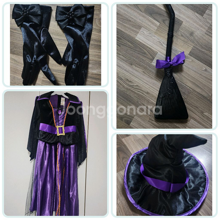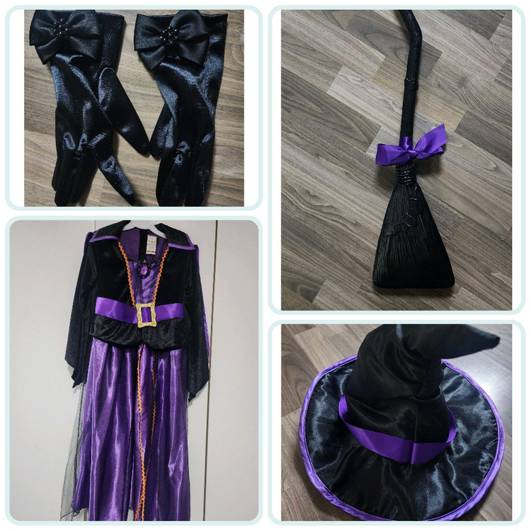 할로윈 마녀 코스튬 세트 판매합니다. 구성품은 드레스, 모자, 빗자루 세트에 장갑이 없어서 따로 추가 구매했어요. 망토 탈부착 가능해요. 전체적으로 검은색과 보라색 조합인데 금색 벨트가 포인트가 되서 영유에서 단체 사진 찍으니 옷이 굉장히 돋보여서 정말 예뻤어요 ^^ 일괄입니다. 빗자루 때문에 택배 불가예요.