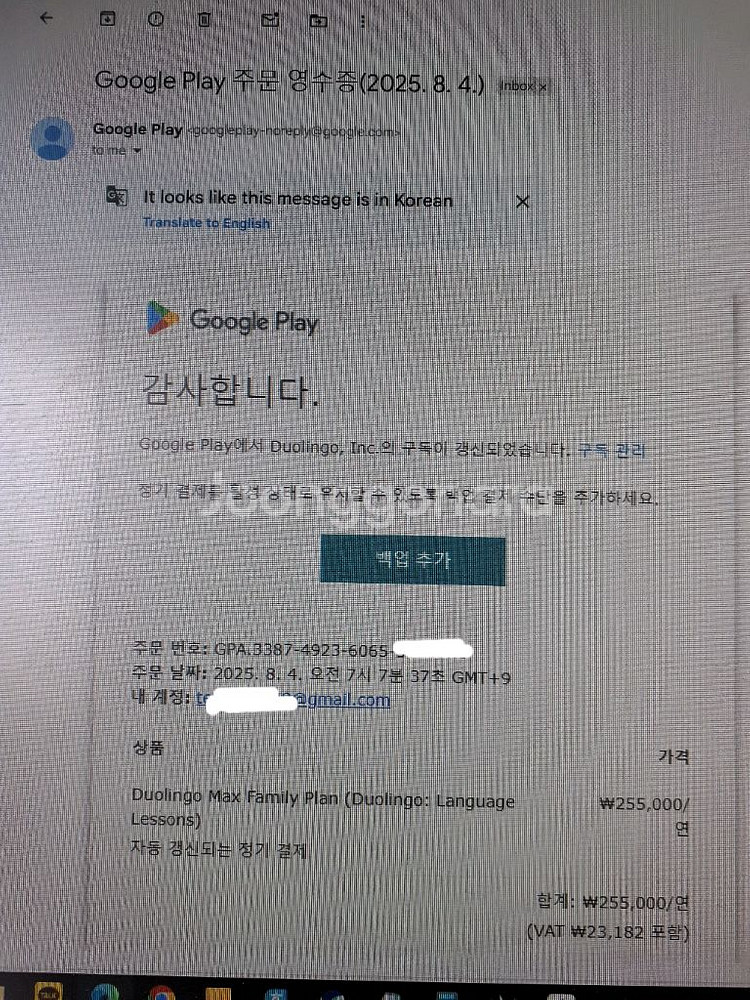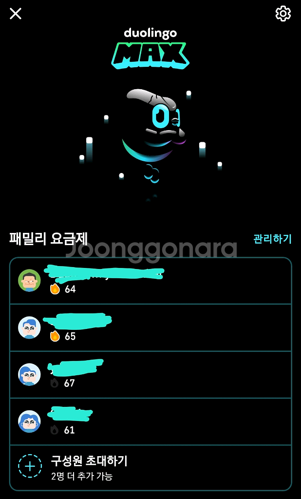 듀오링고 맥스 패밀리에 빈자리가 있어서 잔여석 판매합니다.(월 1만원이하) 1년치 255000원, 12개월, 최대6명이며 현재4명 사용중, 2자리 남았습니다. 2026년 8월3일까지 255000원 결제해 둔 사진첨부합니다. 총6명, 1/n하면 월14167원씩 입니다. 이번기수는 10개월유지되며, 이후 유지는 추후 회원상황에 따라 달라질 수 있지만, 본인 아이디가 사라지는 것이 아니라 MAX FAMILY로 묶어드리는 것이니, 써보시고 추후 구매하셔도 후회없는 가격이라고 봅니다. 10개월 2명 8만원에 판매합니다. 구매하신뒤, 듀오링고 가입후 닉네임 알려주시면 바로 듀오링고 맥스 패밀리 등록해드립니다.