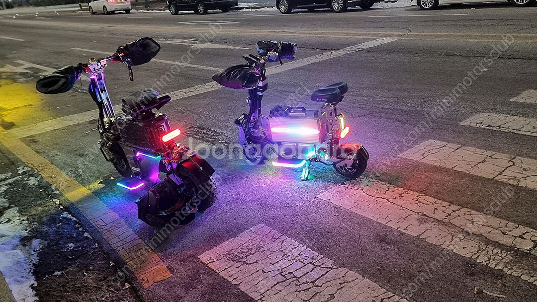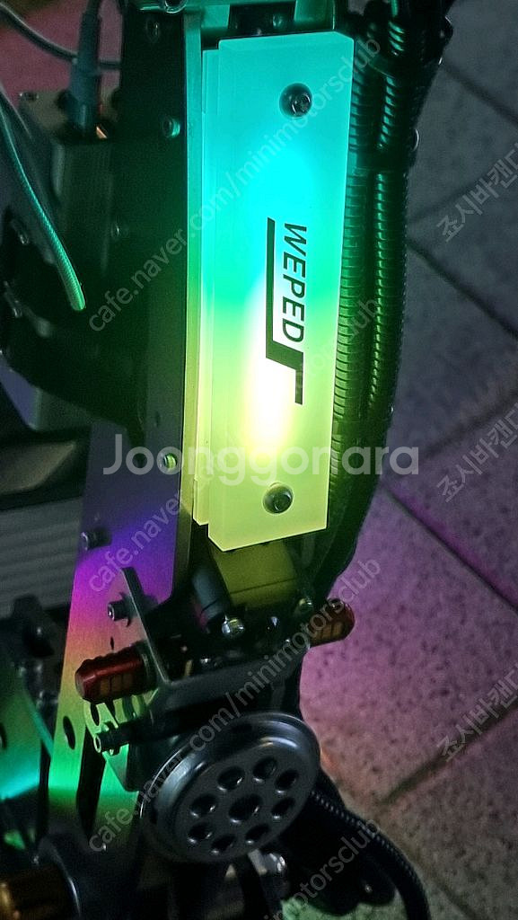 위패드 콤포 맥스 60a 입니다. 새상품 샀구여. 신품가 튜닝 포함 700 오바 들었습니다. 위패드 핸들바 앞 손잡이(간섭피하기 위해 짧게 추가 홀작업) 뒷 손잡이 알미늄 키박스 오토바이스로틀 너트 4P (겁나 잘서요) 용명이 한발. 무선 핸드폰 충전 거치대 DC컨버터 파뱅 장착되어있습니다. 앞뒤 깜빡이(스프릿비스트) 브라켓 직접 제작해서 장착했습니다. 깜빡이 릴레이 속도 조절형. 비상깜빡이 가능하게 작업. 크락션 앞 LED 가니쉬(자체 제작품) 뒤 가니쉬(자체 제작품) 발판 LED (순정품보다 두꺼운 확산판) 네오픽셀 LED 모두 12V 144발 짜리로 밝고 부드럽게 흐릅니다. (폭 10mm) 들어감(순정100발) 밧데리 통 LED(144발)부착 핸들고정 죠시락 장착(본인이 직접 제작) 물튐으로 컨트쇼트 방지를 위한 하단부 이음세 모두 실리콘으로 마감 처리. 등등등 애지중지 하게 열씨미 만들어 놓은 기체 입니다. 평지 90키로까지 나가고 내리막 타면 100도 찍어 봤습니다. 걍 가져가서 타시면 됩니다.~!!! 판매사유는 기변입니다. 사진은 다 올렸으니 사진보시고 궁금한거 있으면 문의 부탁드립니다.