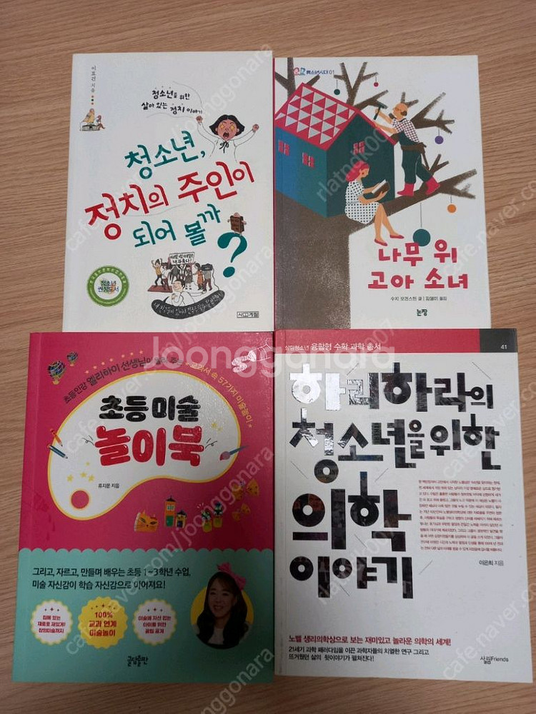 모두 거의 새책 수준입니다. <1권당 6천원씩> 1. 청소년을 위한 하버드 새벽 4시반 2. (10대를 위한 환경교과서) 지구가 뿔났다 3. 인공 왜 지능이 문제일까? 4. 지금 이 순간 청소년 인문학 5. 꼬리에 꼬리를 무는 한국사 인물 이야기 6. 왜 석유가 문제일까? 7. 왜 식량이 문제일까? 8. 교실 밖 수학여행 9. 하리하라의 바이오 사이언스 10. 한번은 꼭 읽어야 할 과학의 역사 11. 하리하라의 과학 블로그 12. 의대를 꿈꾸는 대한민국의 천재들 13. 쇼미더 사이언스 14. 노벨상이 만든 세상 15. 청소년 정치의 주인이 되어 볼까? 16. 나무 위 고아 소녀 17. 하리하라의 청소년을 위한 의학 이야기 18. 초등 미술 놀이북 - 1만원 (카카오톡 아이디 YESKONG)