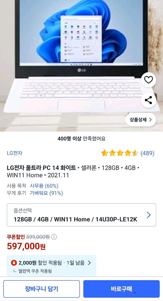 LG 울트라 14인치 노트북 판매합니다. 색상은 화이트입니다. - 모델명: 14U30P-LE12K - 128GB / 4GB -WIN11HOME 실사용은 하지 않아 새거처럼 깨끗합니다 택포