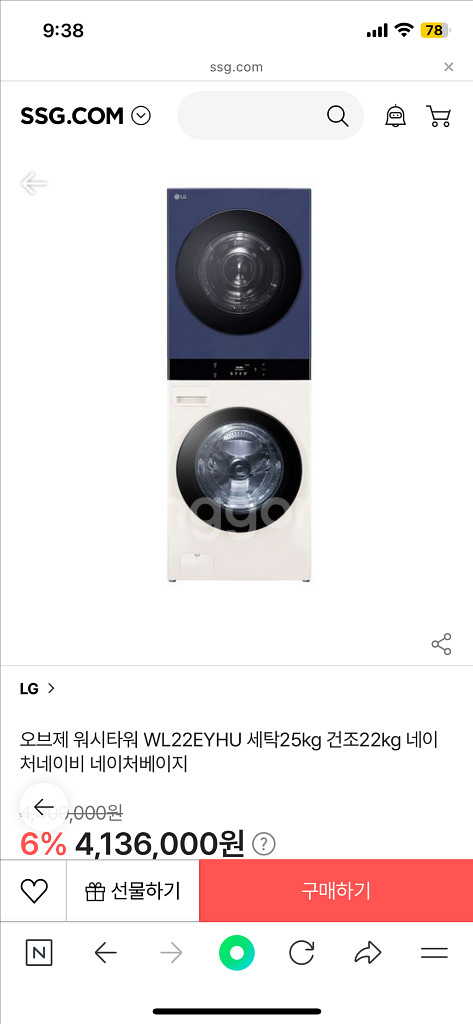 LG 오브제 컬렉션 워시타워 WL22EYHU 모델입니다 - 세탁 25kg, 건조 22kg - 색상은 네이비, 화이트입니다 - 공간 효율을 높여주고, 인공지능 맞춤 건조로 옷감 손상을 줄여줍니다 작년 12월에 구매 후 1월에 설치했어요 아기가 있어 자주 청소하고 깨끗하게 사용했어요 화면 부분 비닐도 안뜯었어요 이사 가게 될 집에 세탁기가 빌트인이라 판매해요 😭