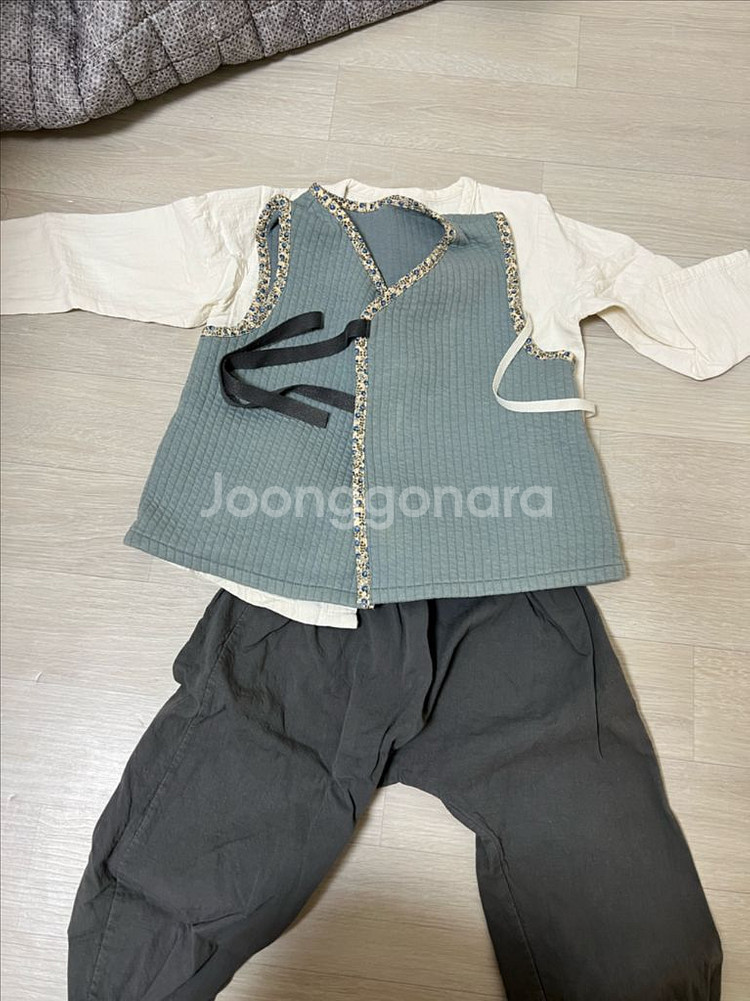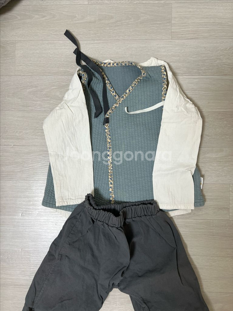 조끼에 흐린얼룩이있는데 티는 많이 안나요! 사이즈 110입니다. 생활한복이라 애기가 정말 편해했어요