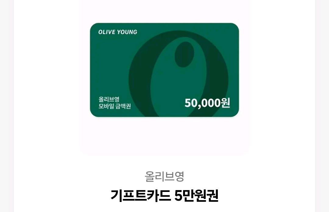 올리브영에서 사용 가능한 5만원 모바일 상품권이에요. 온라인 쇼핑이나 매장에서 자유롭게 사용하실 수 있어요.