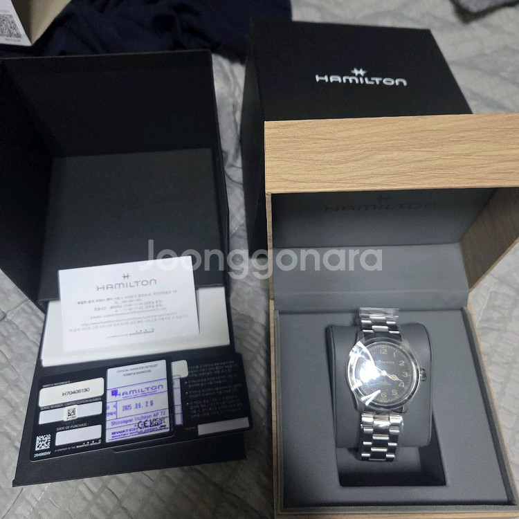 해밀턴 머피 38 메탈 시계 판매합니다. 10월부터 20프로 악세사리 보증 카드 안줍니다 마지막 보증카드 제품입니다 시계와 박스, 설명서 모두 포함되어 있습니다. 구매일자는 25년 9월 29일입니다