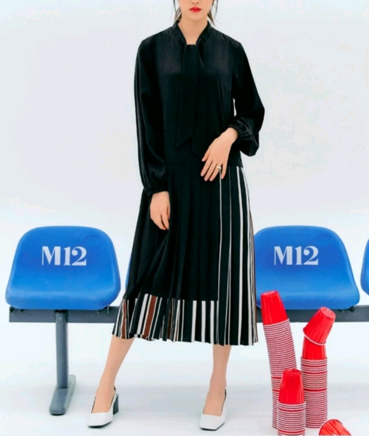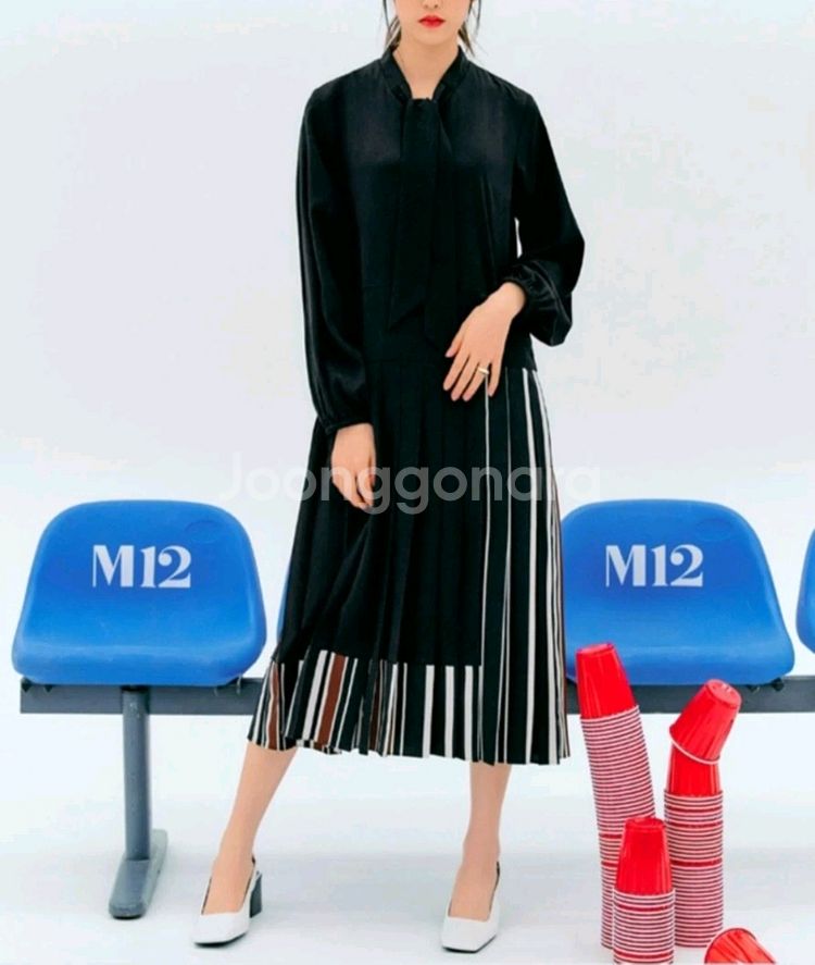 🎯 GS택배 가능합니다. (일반택배 4000원, 반값택배 2000원 추가해 주세요.) M12의 플리츠 원피스입니다. 스커트 부분의 스트라이프 배색 포인트가 유니크합니다. 볼륨 소매가 멋스럽고, 양쪽 옆라인에 포켓 있습니다. 블랙네이비 색상입니다. 여유로운 55사이즈로 66까지 괜찮으실 것 같습니다.