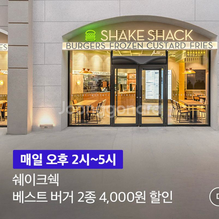 2종 중 택1 * 치킨쉑 버거: 정가 8,700원 → 혜택가 4,700원 * 쉑마이스터 버거: 정가 9,800원 → 혜택가 5,800원 최대 3장까지 구매 가능합니다, 장당 100원 키오스크 사용 불가, 매장 직원에게 제시 해피아워 이벤트로 2-5시까지만 사용 가능 할인 바코드 발행 후 20분 이내 결제 하셔야 해서 매장 가실때 연락 주시면 보내드려요~
