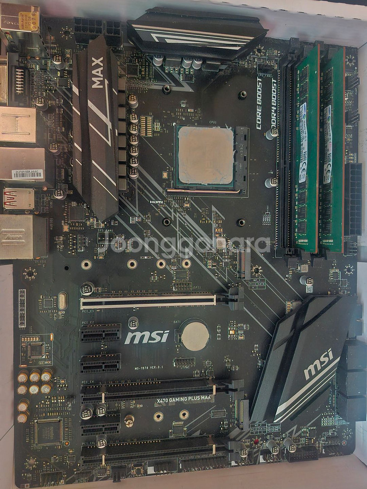 cpu5600 . x470보드(x470 gaming plus max) 삼성램16기가2개 입니다 램속도는 2133입니다 다른 구성품은 없고요 메인보드의 cpu결합때 뒤에 받쳐주는 판떼기만 남아있습니다 나사같은것도 없음 메인보드 박스만 있는상태 사진에 보이는게 다입니다 쓸때 전혀 문제 없던것들 업글해서 팝니다 cpu는 원래의 작은플라스틱곽에 담아서 드립니다