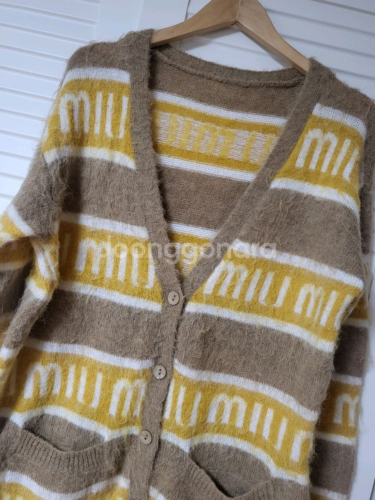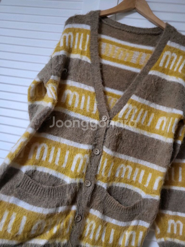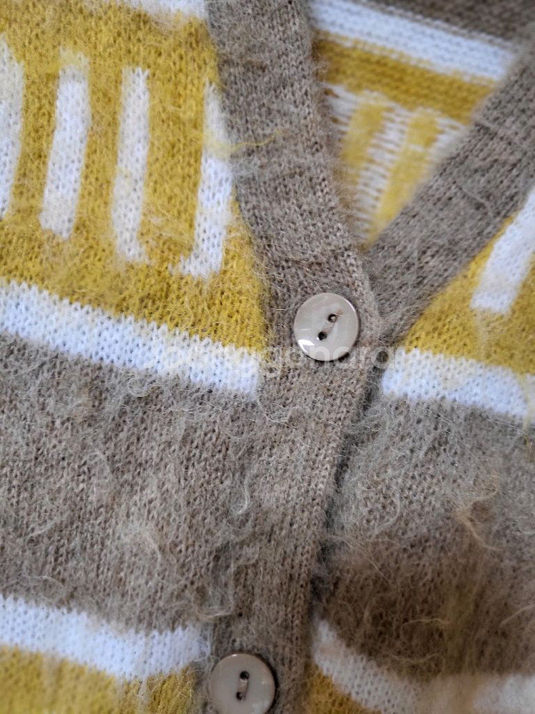 스타일 가디건입니다. 택라벨은없는데 퀄리티 소재감 좋은편입니다. 새상품이나 세탁을한번해서 섬유유연제향이 약간 납니다. 그래도 한번도안입은 새옷 맞습니다. 옐로우와 베이지로 컬러조합으로 세련 부드럽고 폭신한소재(두껍지는않아요) 실측가단54/총장 69 (55~77추천)