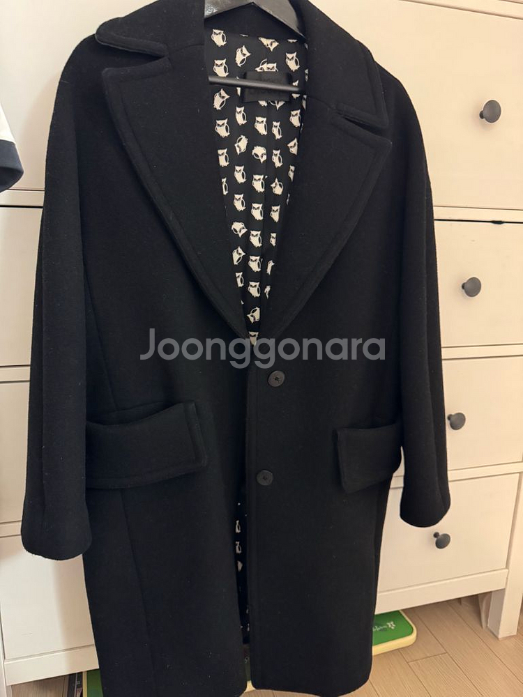 럭키슈에뜨 블랙 코트 36사이즈입니다 모 95%(캐시미어 2%)와 나일론 5% 혼방 소재로 부드럽고 따뜻해요 안감은 귀여운 올빼미 패턴으로 되어있고, 단추에도 올빼미 디테일이 있어 유니크한 매력이 있어요