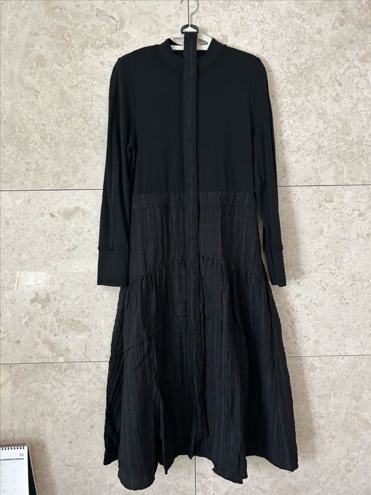 블랙 컬러의 롱 원피스 판매해요 상의는 저지 소재로 편안하고, 하의는 플리츠 디자인으로 세련된 느낌을 줍니다 허리에는 벨트가 있어 라인을 잡아줄 수 있고, D링 디테일이 포인트가 돼요 전체적으로 깨끗하고 좋은 상태입니다 착불 2만원입니다 반품, 환불, 예민하신 분은 사양합니다