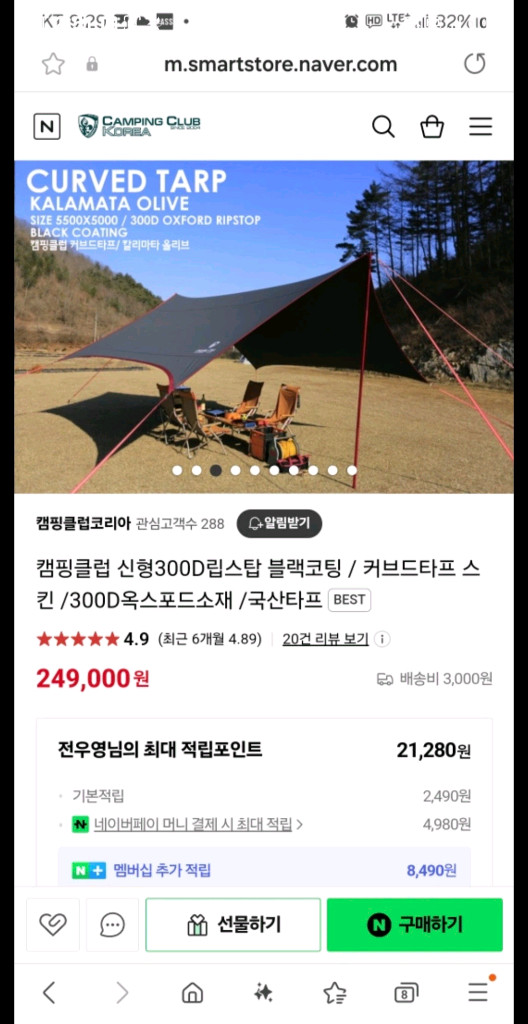 * 구매한다면서 사기 사이트에 올려달라는 벌레들 접근금지! 욕 오지게 처먹습니다. 저 내공 심각하게 쎕니다. 내구성 좋은 국산 타프입니다(미사용 메인 폴대 포함). 전용가방 포함입니다. 폴대까지 거의 30만원 상당입니다. 저가 타프는 비닐봉지같은 느낌이 나고 떨어지는 나뭇가지나 파쇄석에 취약하지만, 이 제품은 묵직하며 긁힘이나 찢김에 강합니다. 귀찮아서 여름에만 사용 했습니다. 실사용 5회정도 됩니다. 제가 타프 잘 못치는데 빳빳하게 잘치면 일반 타프 보다 멋집니다. 크기는 사진 참고해 주세요. 택배 가능은 하지만 가급적 직거래 원합니다. 서울 동대문구 장안 래미안2차 혹은 건대입구, 청담역 *어이없는 가격제안하는분들 있는데 연락 안했으면 좋겠습니다. 예의 아닐뿐더러 급매 아닙니다. 네고 불가