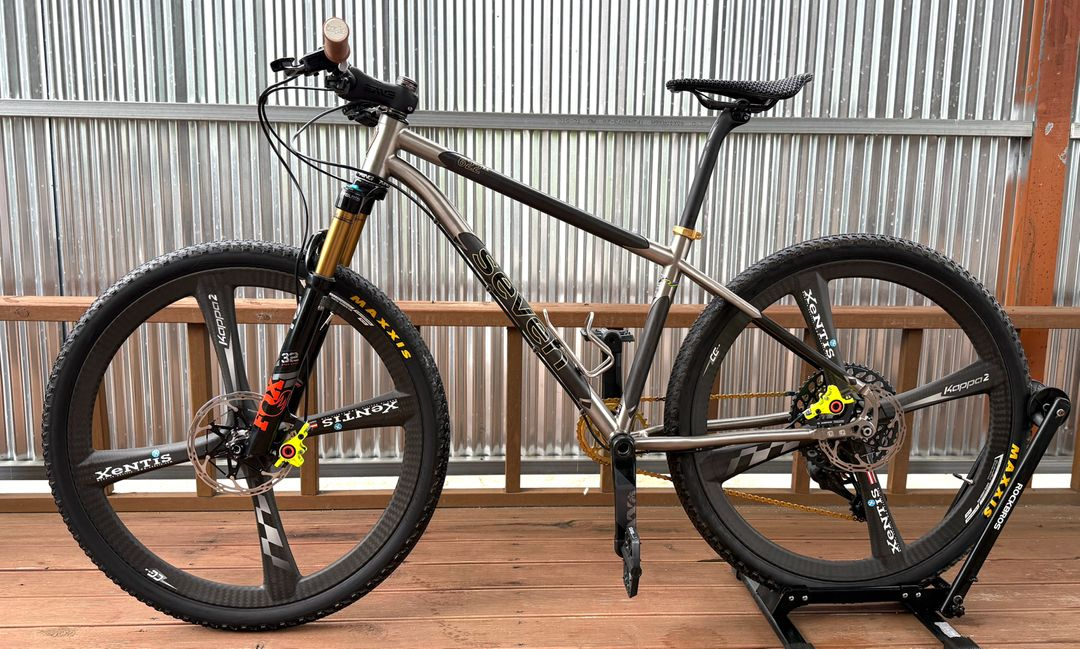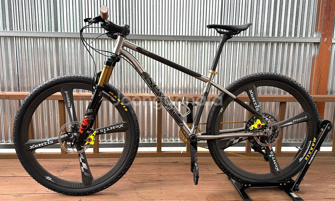세븐 622m xx 티타늄-카본 최상급 구성 판매합니다. - 세븐 사이클 622m xx 티타늄-카본 프레임: 27.5인치, 세븐기준13.4인치, 키165-175 최적, 정품카드 포함 - 폭스 32 SC 팩토리 100mm 에어샥: 27.5인치, 3단 리모트 포함 - 젠티스 카파2 27.5인치 카본 휠셋 - 스램 XX1 AXS 12단 무선구동계 - 마구라 MT8 리미티드 에디션 브레이크세트 - 엔비 카본 3종: 엔비M5카본핸들바(노커팅), 엔비카본스템, 엔비카본싯포스트 - 크리스킹 헤드셋: 유광블랙 - 킹케이지 티타늄 물통케이지 - 셀레 산마르코 3D 안장: 카본레일 - 서비스: XTR 클릿페달 세븐 사이클사의 최상급 티타늄-카본 프레임으로 티타늄과 카본의 조화로운 주행질감을 느낄 수 있으며 최상급 부품으로 블랙, 골드, 티타늄 색상을 적절하게 구성하였습니다. 무게는 평페달 포함 9.07kg으로 경량화 또한 놓치지 않았습니다. 프레임 및 모든 부품이 신품수준 컨디션으로 소장용으로도 손색 없을 것입니다. 대구 직거래/ 타지역 화물 가능 900만원 (네고XX, 개별부품판매XX)