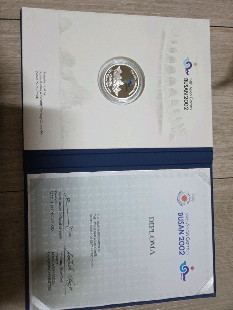 2002년 부산아시안게임 참가선수 증정용 은메달입니다. 한정판으로 소장가치 매우 높습니다. 귀한 물품 소장하세요. 은메달 프루푸입니다. 귀한거라 네고는 정중히 사양합니다. 쿨거래시 택비 무료입니다