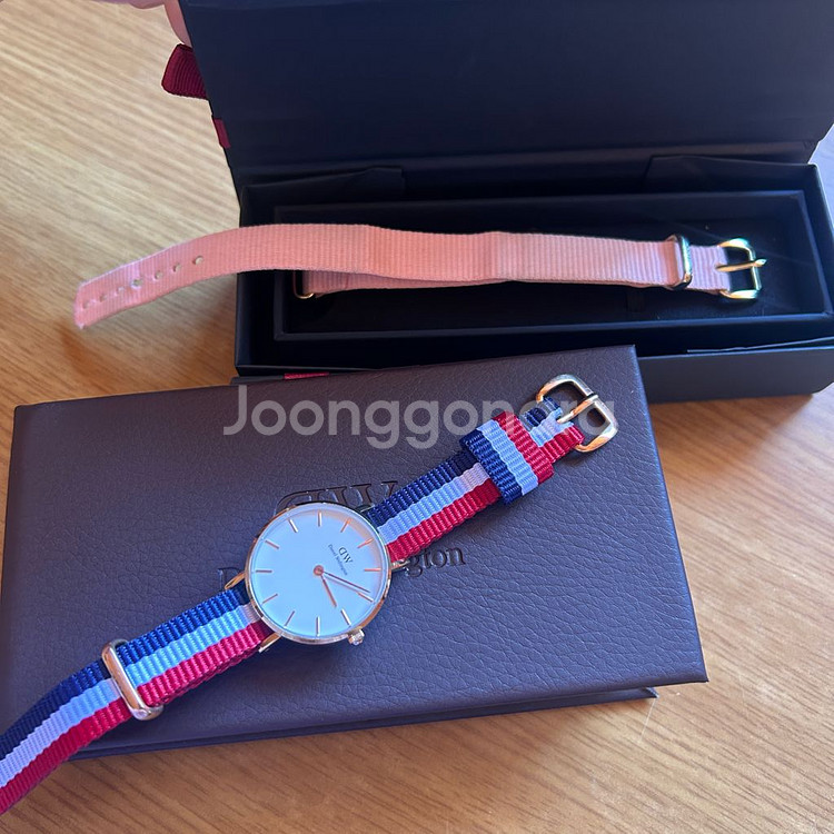 다니엘 웰링턴 여성 시계 판매합니다. 시계줄이 총 3개라서, 그날 코디에 맞춰서 착용 가능합니다. 보증서 포함된 제품입니다. 약 있어서 작동중이에요. gs반값택배 포함 일반택배+2000 줄무늬 줄: 새것 분홍색 줄: 손목 길이에 맞춰 자른 것 가죽 줄: 사용감 있음