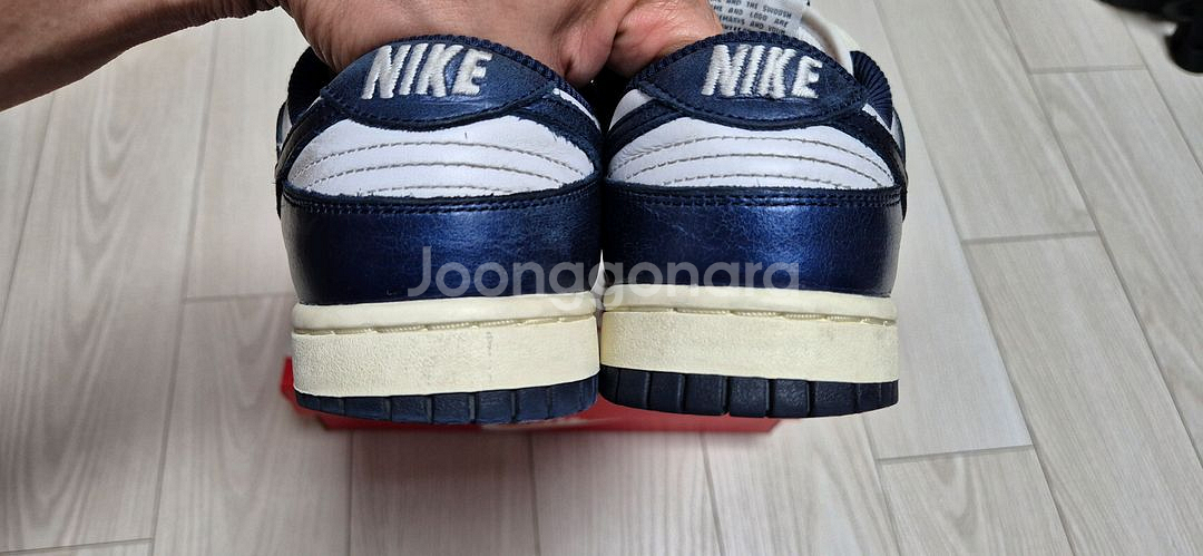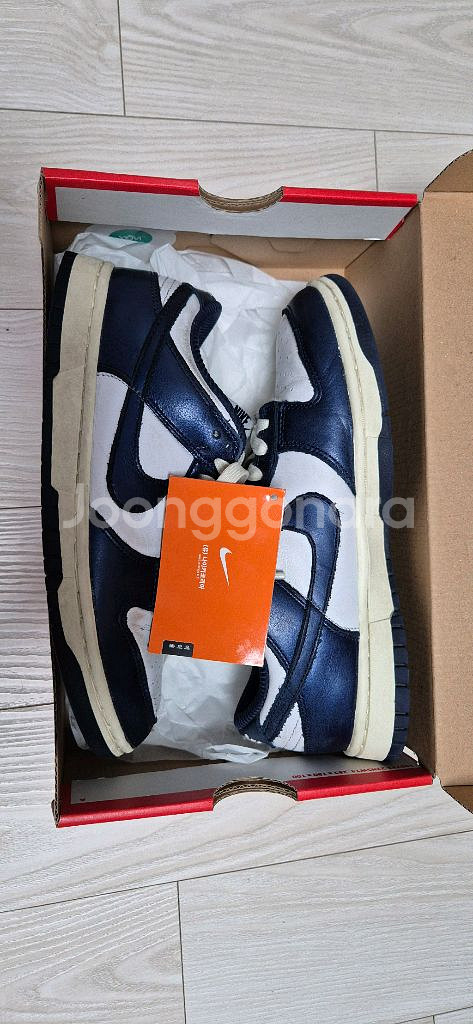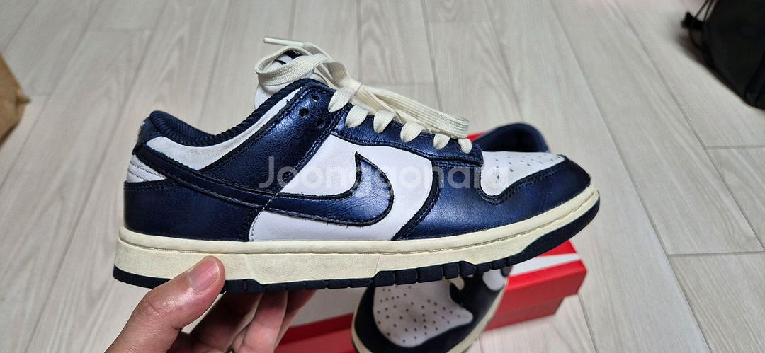 나이키 덩크 프리미엄 midnight navy and white 240mm 가죽에 살짝 펄이 들어가있는 우먼스 덩크 프리미엄 240mm 입니다. 아직 펄 살아있구요. 초등 아이용으로 구매했고 발이 너무 빨리 커져서 한철 신고 내놓습니다. 안에 헤진곳이나 뜯어진곳은 없구요. 우먼스 제품이라 발작으신 여성분도 착용가능합니다. 박스와 나코탭 포함