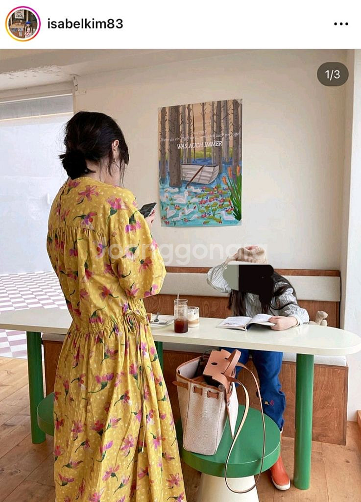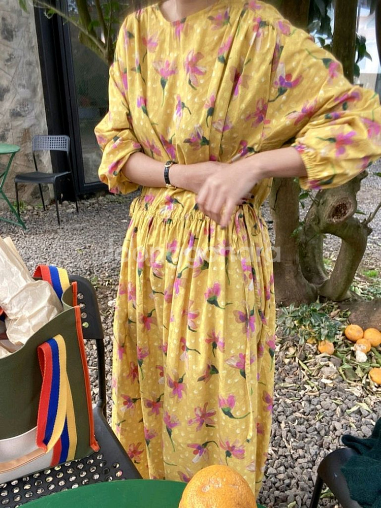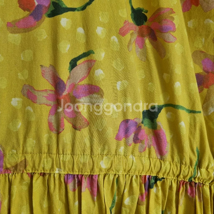 노란색 바탕에 핑크색 플라워 패턴이 있는 롱 원피스입니다. 허리 부분에 끈으로 조절할 수 있는 디자인입니다. 밝고 화사한 느낌을 줍니다 입으면 산뜻하고 화려해요^^ 자주 입을 수 있는 스타일는 아니어서 많이 안 입었는데 코튼특성상 구김있고 얼룩 1곳 보여서 사진 첨부합니다 cotton 100 가슴둘레 135.5cm 총길이 130cm 모델 키 165cm입니다