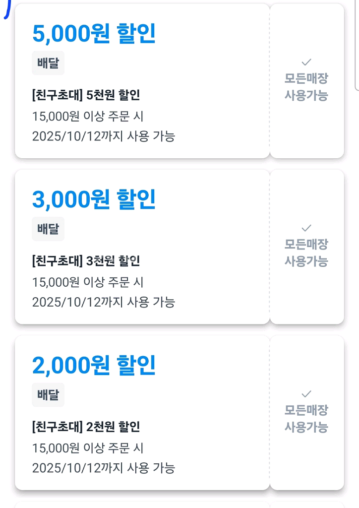 쿠팡이츠 2000원 할인 대리 구매 해드려요. ex 15000원 -2000원 = 13000원 ((최소주문 15000원) 배달거리 2.5km 이상시 1000원만 할인됩니다 ㅜㅜ 가게 자체할인 중복 적용 가능합니다. 배민x, 요기요x 컴포즈 , 공차, 멕시카나, 베라 ,호식이 ,맥날, 도미노, 치킨, 피자, 메가, bbq, 파바, bhc, 요아정 등등 전메뉴 가능 *무료배달* 고객 부담/ 배달비 xx