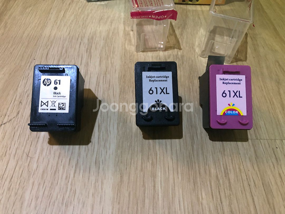 HP Envy 5530 잉크 입니다 - 61 잉크 카트리지 - 흑색, 컬러 2가지 이구요. (2개 세트 가격이요~) 사진 좌측부터 1번, 2번, 3번 중 2번과 3번은 미사용 제일 좌측 1번 정품은 되는지 모르겠어요 (프린터 잉크 없는 줄 알고 2번, 3번 잉크 주문 했는데 프린터가 사망이네요)