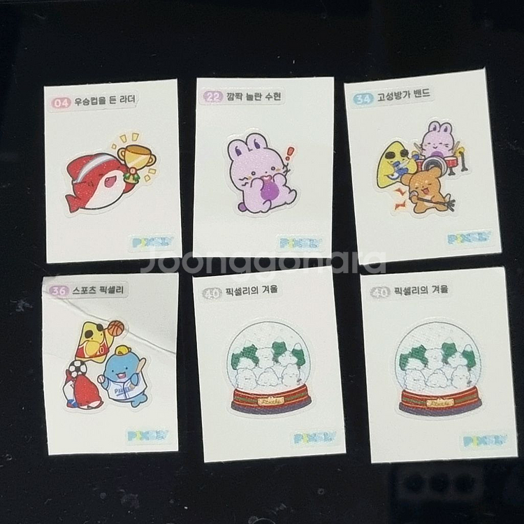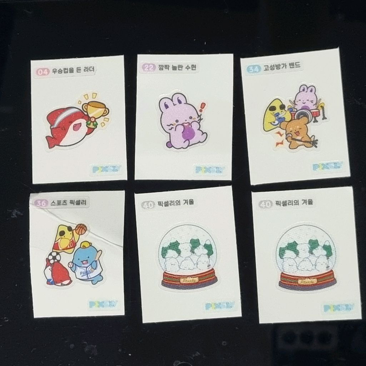 픽셀리빵 띠부띠부씰 04 우승컵을 든 라더 22 깜짝 놀란 수현 (판매완) 34 고성방가 밴드 (판매완) 36 스포츠 픽셀리 (접힌 흔적 있음, 500원) 40 픽셀리의 겨울 (판매완) 각각 판매합니다. 네고 가능 우편 +500원 편의점반택 +1800원