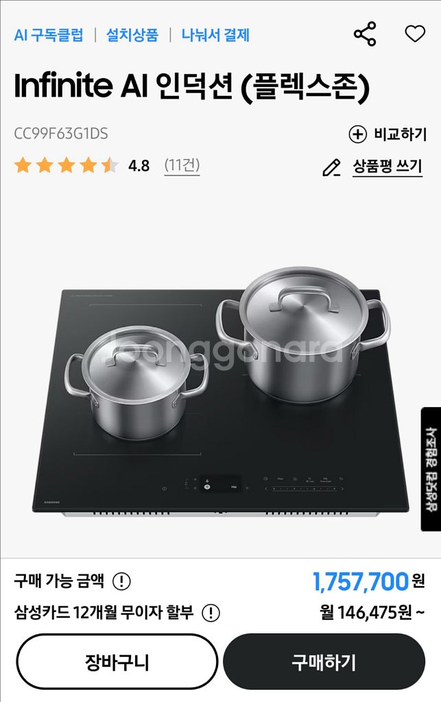삼성 인피니트 AI 인덕션(플렉스존) 새상품입니다 모델명은 CC99F63G1DS 입니다 - 플렉스존으로 다양한 요리 가능 - AI 기능으로 최적의 화력 조절 - 스마트싱스 연결로 편리하게 사용 - 정가는 1,757,700원이에요 *인터넷에 찾아보니 최저가는 155만원으로 나오네요* 자세한 설명은 링크 참고부탁드립니다! https://www.samsung.com/sec/electric-range/cooktop-cc99f63g1ds-d2c/CC99F63G1DS/ 박스도 그대로 있는 새상품입니다